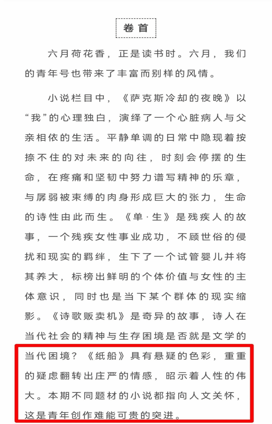 在《中国校园文学·青年号》第六期卷首语中写道:“《纸船》具有悬疑的色彩,重重的疑虑翻转出庄严的情感,昭示着人性的伟大。”