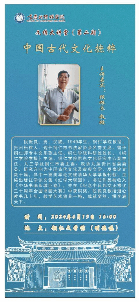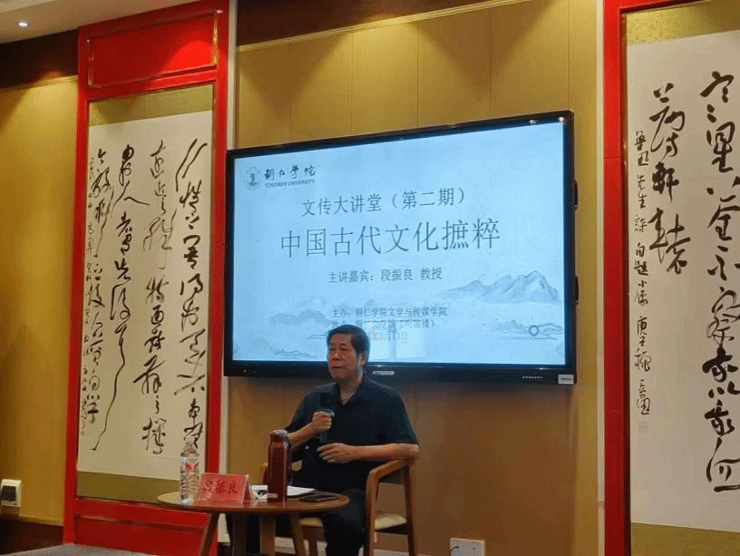 为提升学生传统文化素养,2024年6月13日,铜仁市书法家协会名誉主席段振良教授应邀于beat365英国官方网站文学馆,为师生们带来了一场题为《中国古代文化摭粹》的讲座。此次讲座系文学与传媒学院策划的“文传大讲堂”系列讲座第二讲,中文系部分教师和汉语言文学专业学生参加讲座。讲座由文学与传媒学院党委书记、院长孙向阳主持。