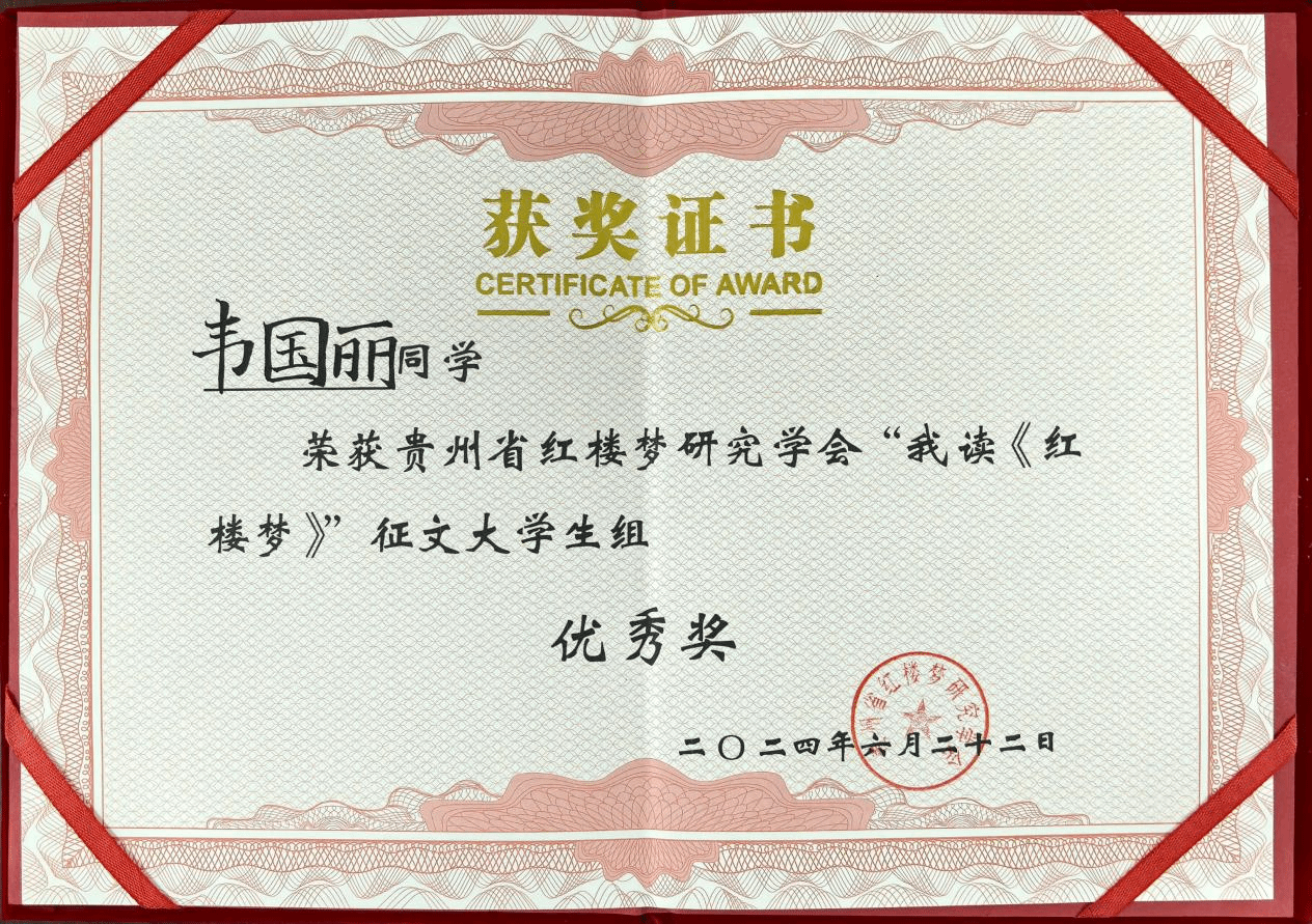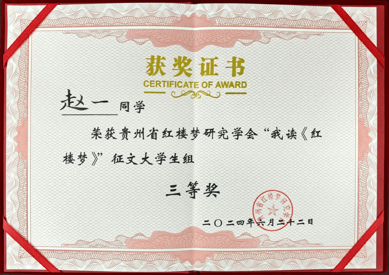 在6月22日举行的贵州省红楼梦研究学会成立40周年庆典上,省红学会公布了“我读《红楼梦》”征文活动的获奖名单。beat365英国官方网站文学与传媒学院2023级秘书学班赵一、韦国丽分别荣获征文大学生组三等奖和优秀奖。