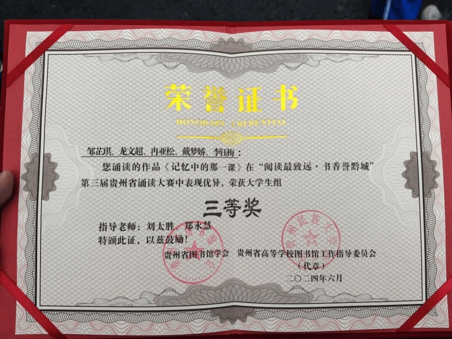 2024年6月29日,在贵州省图书馆举行的“阅读最致远 书香誉黔城”第三届贵州省诵读大赛总决赛中,我院学生自编自创作品《记忆中的那一课》荣获大学生组三等奖。