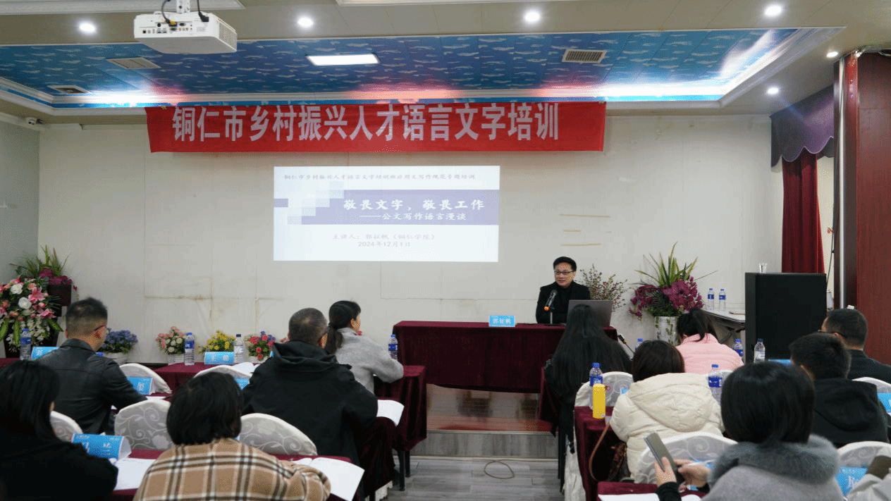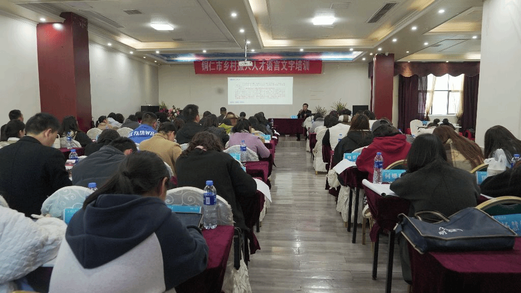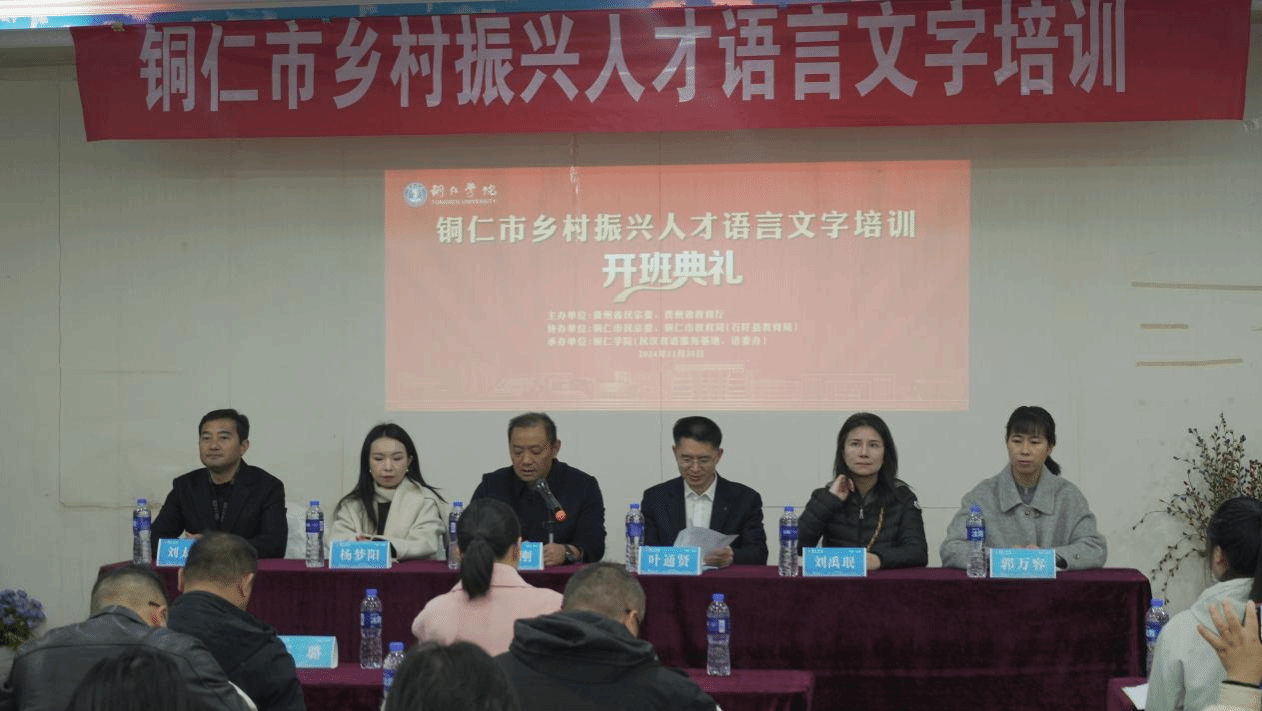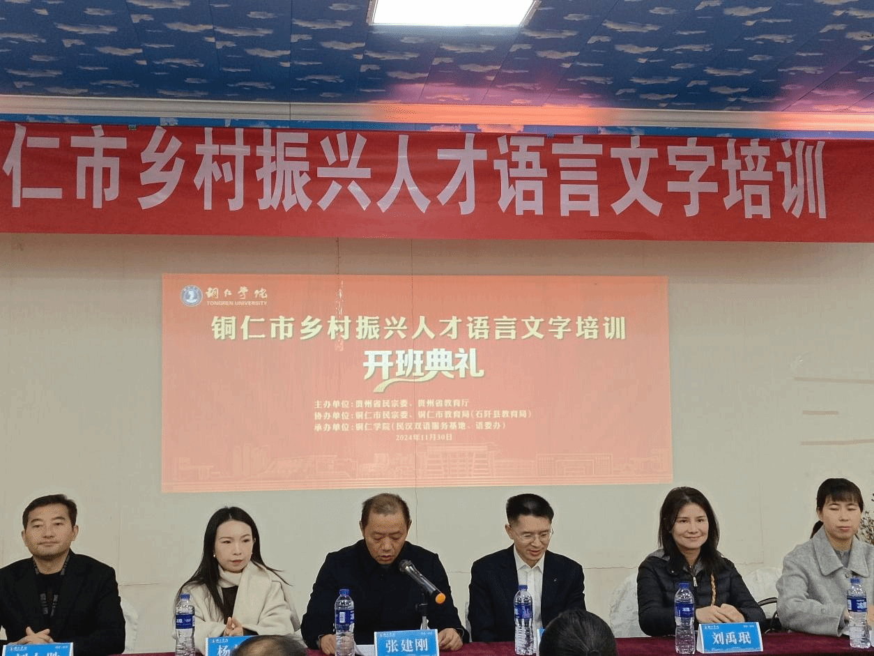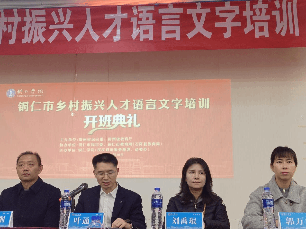 11月29日至12月1日,由省民族宗教事务委员会和教育厅主办,beat365与铜仁市民宗委、教育局联合承办的铜仁市乡村振兴人才语言文字培训在希悦大酒店开班。铜仁市教育局党组成员、副局长叶通贤,beat365文学与传媒学院副院长张建刚,办公室主任刘禹珉,团总支负责人杨梦阳,石阡县教育局副局长郭万容,beat365英国官方网站贵州省民汉双语服务基地办公室主任刘太胜出席开班仪式,来自铜仁市民宗委、各区县民宗局干部,石阡县教育系统干部、教师以及beat365学生代表共90人参加培训,开班仪式由刘太胜主持。