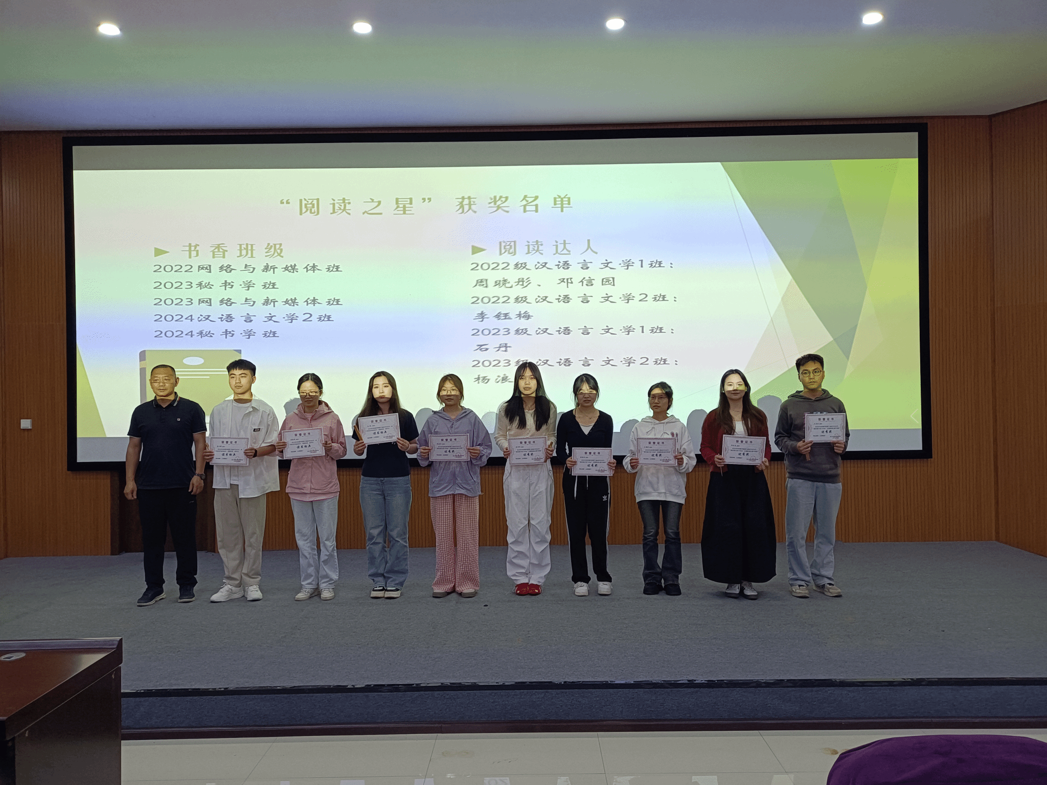 仪式伊始,杨雪宣读了《文学与传媒学院关于表彰第三届读书文化节“阅读之星”的决定》文件,随后我院领导班子成员为获奖班级、学生颁发了荣誉证书和纪念书签。仪式现场,2024级学生还呈现了一场精彩纷呈的文艺表演,汉语言文学专业的歌曲独唱悠扬婉转,秘书学专业的配乐诗朗诵《月光下的中国》饱含深情,网络与新媒体专业的舞蹈古今交融,为仪式营造了浓厚的艺术氛围,以艺术形式展现了阅读的魅力。