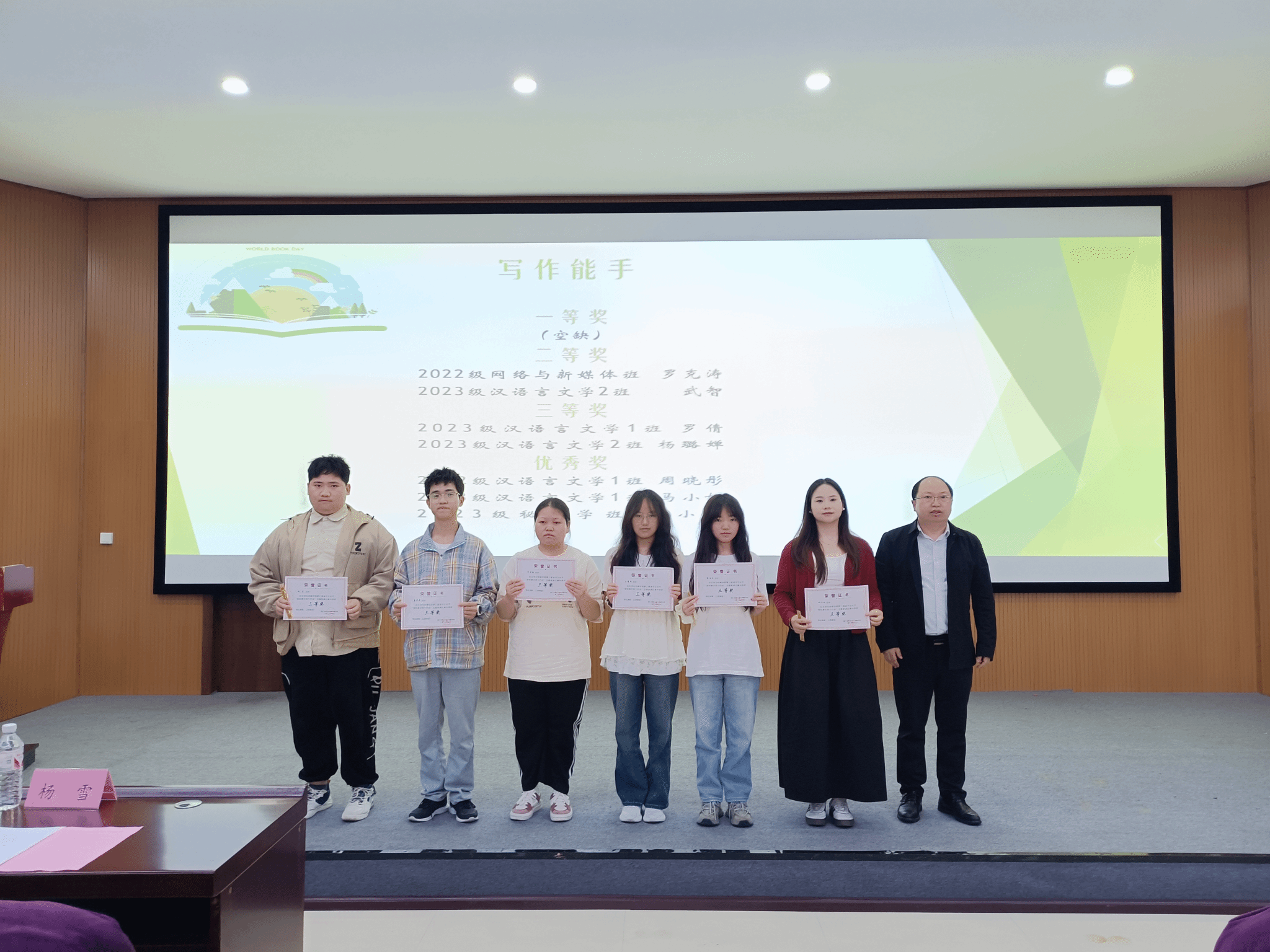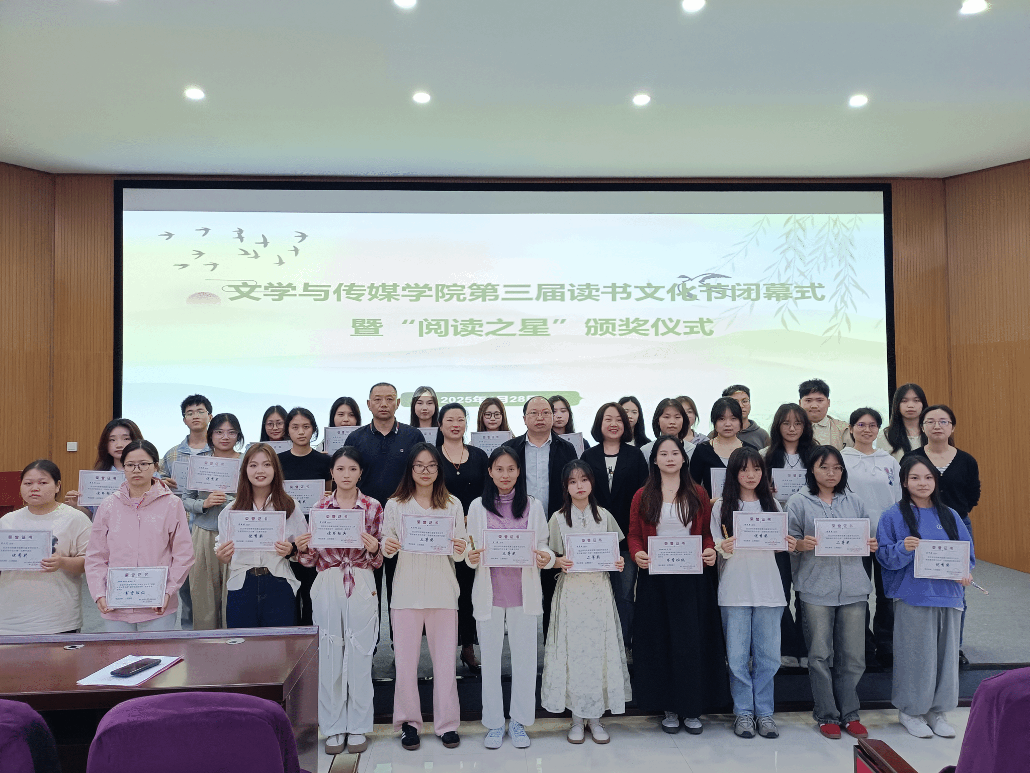 本届读书文化节开展了“悦读时光,共品书香”班级读书交流会、“寻迹黔山秀水·书写文化新章”主题现场作文大赛、“我与春天有个约会”主题朗诵比赛、新书分享会、文学趣味漫步等系列活动。学院全体师生都积极参与其中,参与总人次达400人次以上。评选出“阅读之星”包含“书香班级”5个、“阅读达人” 5人 、“读书标兵”11人、“写作能手”7人、“优秀朗诵者”团队(个人)共28人。此次读书文化节“阅读之星”颁奖仪式,不仅为第三届读书文化节画上了圆满句号,更是持续在师生心中种下阅读的种子。