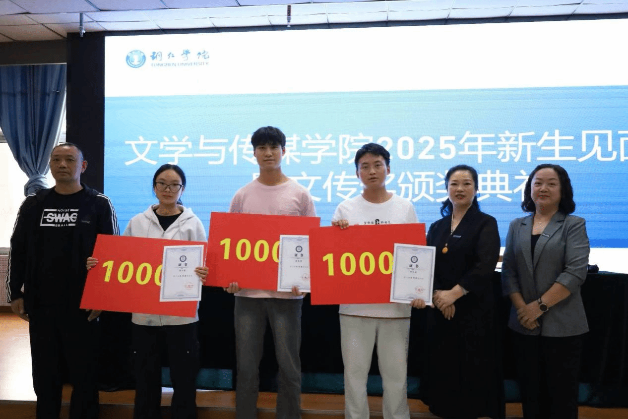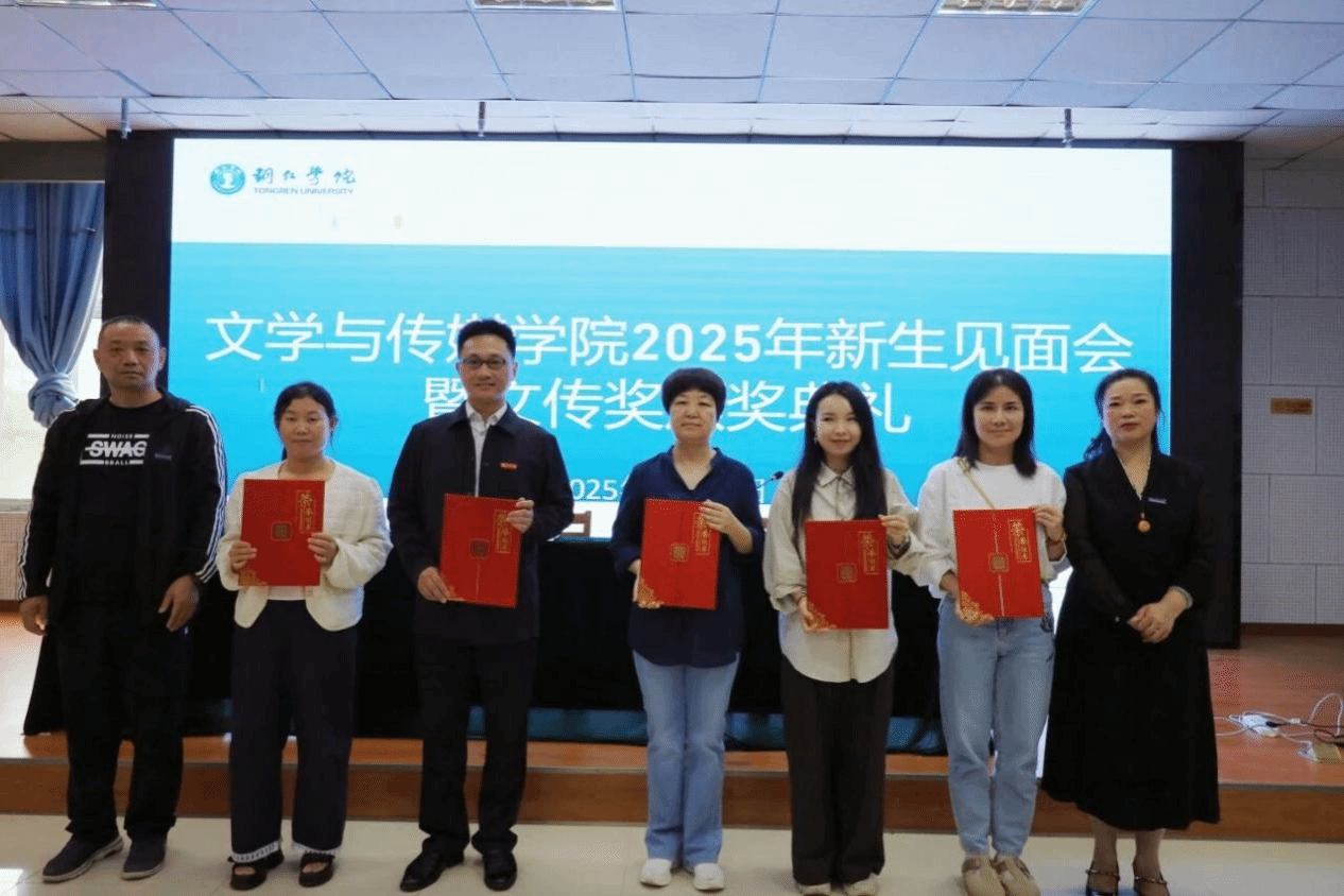 在颁奖环节,院领导班子为教师节获学校表彰的教师颁发荣誉证书。张建刚宣读了2025年文传奖获奖名单,院领导为获奖学生颁奖。