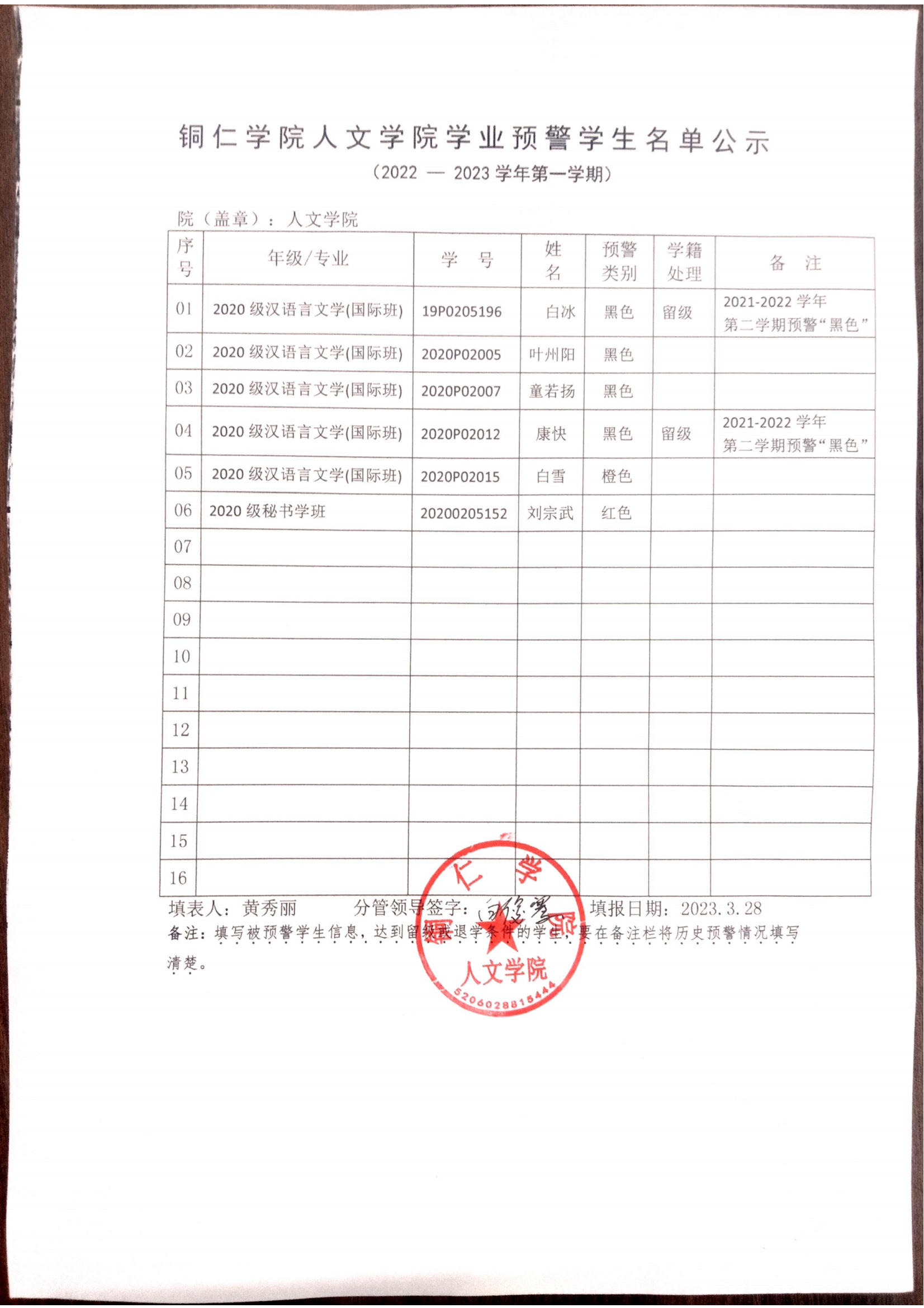 beat365英国官方网站人文学院学业预警学生名单公示 (2022 — 2023学年第一学期)
