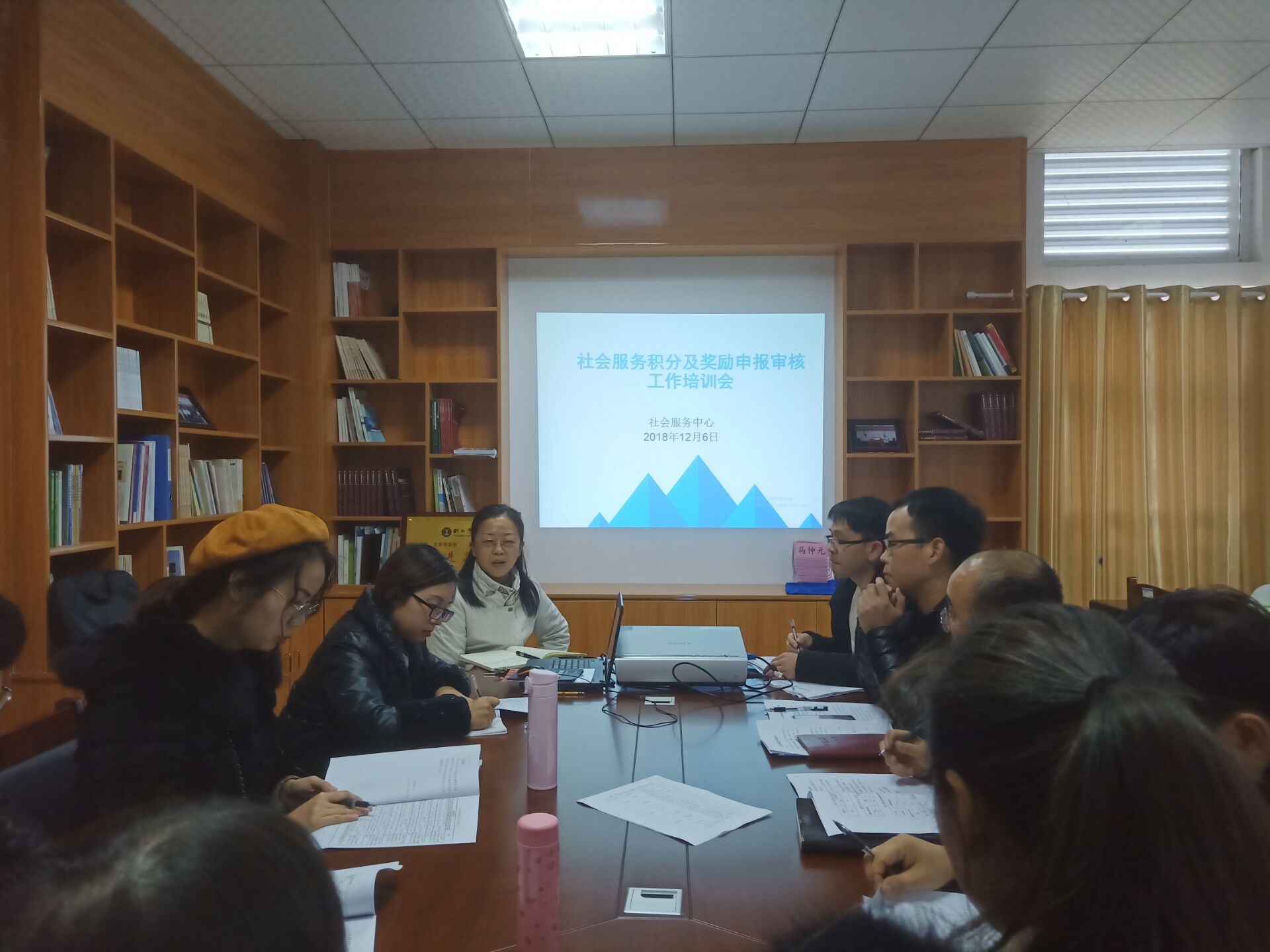 2018年12月6日下午,在行政楼8525会议室举行2018年社会服务项目成果奖励和工作积分审核工作培训会。社会服务中心主任罗静、科员杨忠华和各学院社会服务科负责人参会,会议由社会服务中心主任罗静主持。