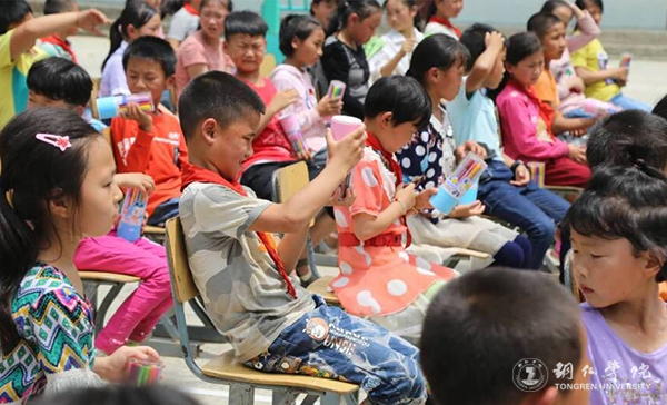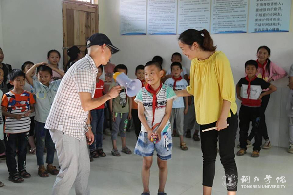 在南坪村完小学生的课间休息期间,陈方超博士、曾维华博士以及教育学院大二心理学专业学生罗莉为完小孩子们带来了精彩的教育心理活动,老师们与孩子们一起玩游戏、一起谈游戏中的感想并表演相关节目,让孩子们通过教育心理活动,学会学习、学会求知、学会感恩、学会做人。