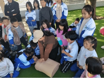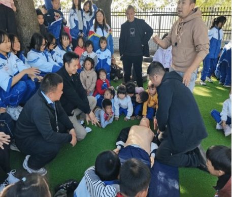 在培训中,杨芬教授为四年级的同学们做了一场“海姆立克急救法”的课程教学,她从同学们在吃饭堵塞咽喉等日常生活行为出发,以小学生们最感兴趣的实践问题边讲解边实践示范,同学们一边开心回答问题,一边以实际生活中遇到的相关问题向杨芬教授提问,杨芬教授运用体育专业知识,结合“海姆立克”急救知识一一回答,并对每一个上台参加实践操作的学生进行细心的指导,使全班34名学生都掌握了“海姆立克急救法”技能。方新博士、周智红教授、张玉军教授为部分老师、8年级(1)班学生进行“心肺复苏”技能的培训,方新博士从发现病人、环境评估、自我保护措施、120拨打、旁人救援、以及对病人实施心肺复苏实际规范性操作、病人复苏心理安慰等进行了讲解与演示。培训过程中,部分老师、学生亲自进行现场演练,培训项目成员进行现场规范指导,并真实体会到一个病人在发生危急情况下所需要的“现场应急救护”是多么的重要,并认真反复进行规范性练习,掌握了“心肺复苏”急救实践的基本操作。