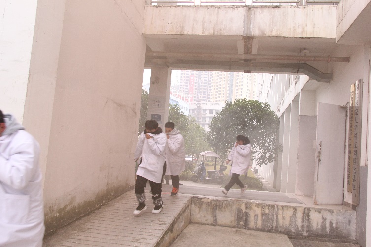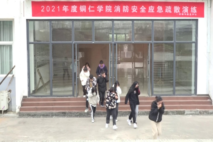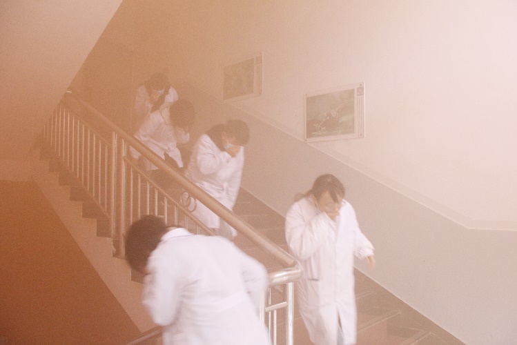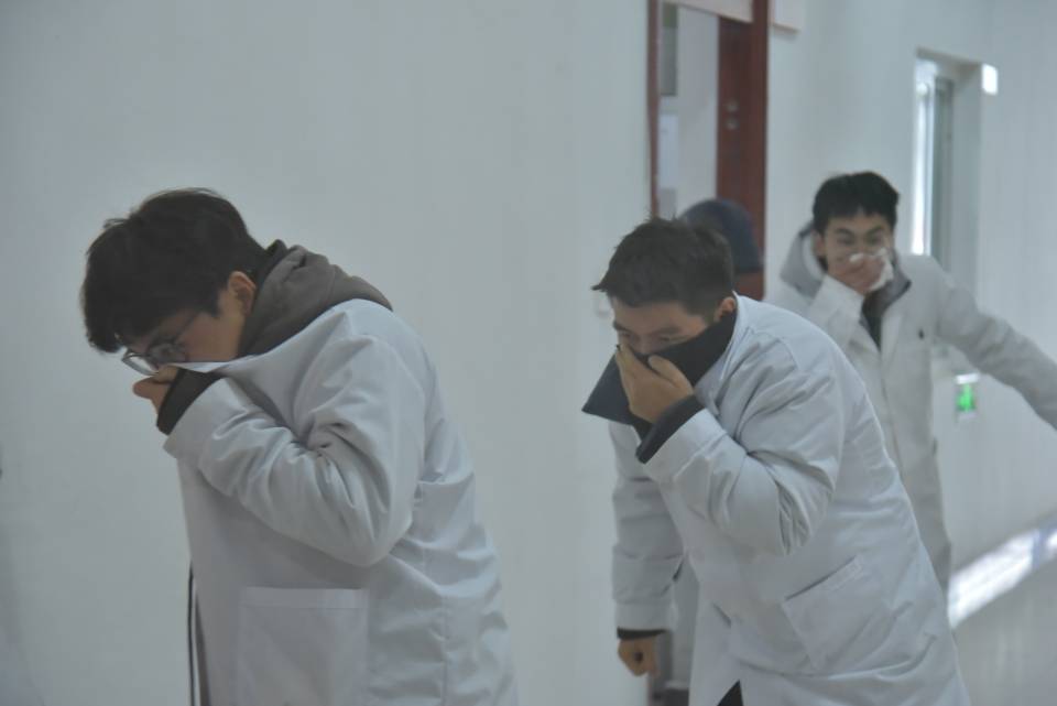 第二项进行的是疏散演练。实验楼内师生听到消防警报后,在各楼层负责教师的引导下,用衣物、手捂住口鼻,通过消防通道有序撤离至实验楼外指定安全区域,各楼层负责教师对相应楼层的实验室、办公室等地进行检查,确保楼内全部人员安全撤离。