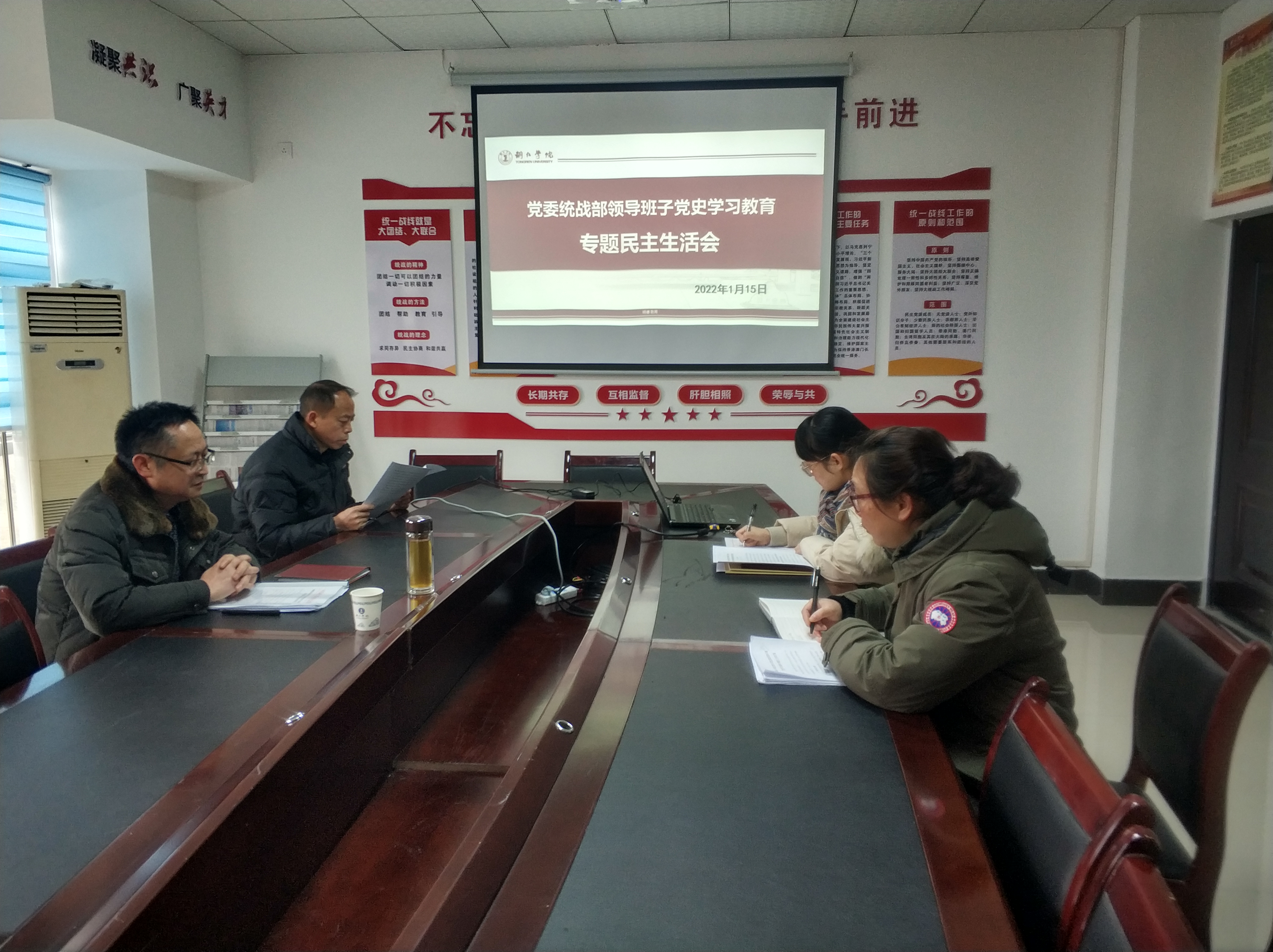 按照中央、省委、市委和校党委关于开好党史学习教育专题民主生活会的通知精神和要求,校党委统战部领导班子及成员紧扣党史学习教育专题民主生活会主题,深入学习研讨、广泛听取意见、切实聚焦5个方面查找问题并开展党性分析、深入谈心交心开展批评与自我批评、立行立改落实整改,在充分准备的基础上,于2020年1月15日召开了统战部领导班子党史学习教育专题民主生活会。会议由校党委委员、统战部部长刘德平主持,统战部班子成员参加会议,其他党员干部列席会议。