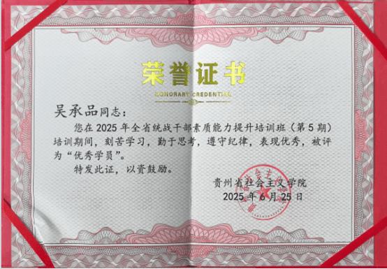 培训过程中,吴承品同志作为培训班班长,团结带领班委团队负责全班学员的学习、生活和思想管理,组织策划了汇报演出,并组织评选出优秀学员。在结业仪式上,吴承品同志作为优秀学员代表发言,圆满完成了本次培训任务。