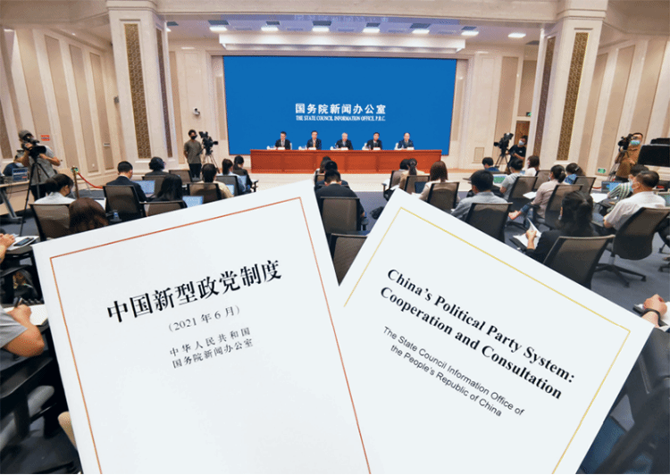 国务院新闻办公室于2021年6月25日发布《中国新型政党制度》白皮书,并举行新闻发布会。这部白皮书全面回顾了中国新型政党制度的产生、发展和不断完善的历程,介绍了这一制度的鲜明特色,总结了长期以来特别是中共十八大以来中国新型政党制度建设取得的重要成果和成功经验。图为新闻发布会现场。中央统战部供图