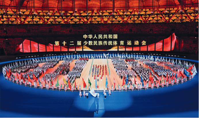 2024年11月22日,中华人民共和国第十二届少数民族传统体育运动会开幕式在海南省三亚市举行,56个民族欢聚一堂,共同奏响中华民族一家亲、同心共筑中国梦的华美乐章。图为开幕式现场。 新华社记者 郭程/摄