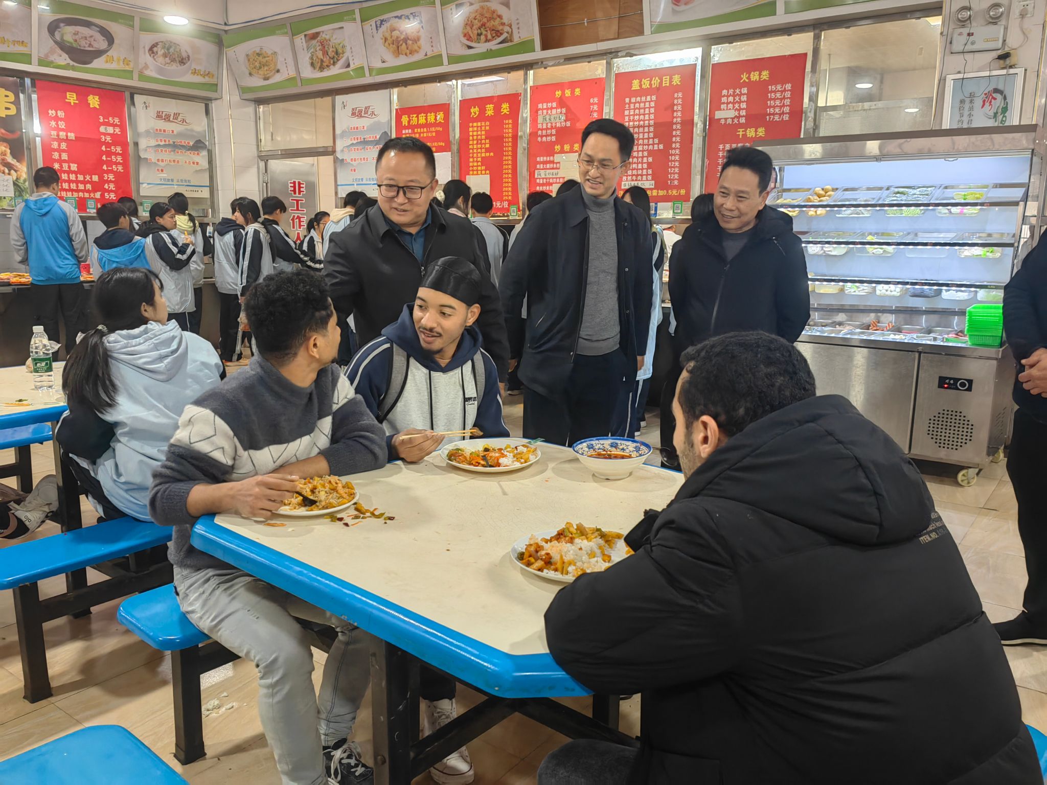 鲁道旺、肖庭华一行深入食堂后厨、用餐区等区域,细致了解食材采购、食品加工、环境卫生、菜品供应及价格等情况,认真听取乌江学院在餐饮服务、基础设施维护等方面存在的实际困难与意见建议。在食堂现场,他们与正在用餐的研究生志愿者及留学生进行了亲切交谈,仔细询问同学们对饭菜口味、种类、价格以及日常学习生活服务等方面的感受与需求,并对同学们参与志愿服务、积极融入校园生活表示赞许。