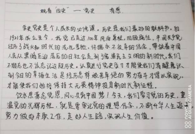 2020级预理四班李蝶:学习党史是个人成长必修课。历史是我们最好的教科书,自1921年成立至今,我党已走过100年风雨兼程,回顾既往,中国共产党经历了战火和时代的洗礼考验,怀揣永不放弃的信念,带领着中国人民从黑暗压迫落后的旧社会走到了富强民主文明的新时代,我们不能忘也不该忘记这段历史。认真进行党史学习才能使我们清醒意识到今时今日的幸福生活是经历怎样艰苦卓绝的努力奋斗才得以实现,才能使我们发自内心感受到肩上的使命与责任,才能使我们始终保持大无畏精神投身新时代新征程。饮水思源念党恩,同心共筑中国梦!今天,我们学习党的历史,重温党的光辉历程,就是要牢记党的思想信念,不断升华人生追求,努力做好本职工作,走好人生路,实现人生价值。