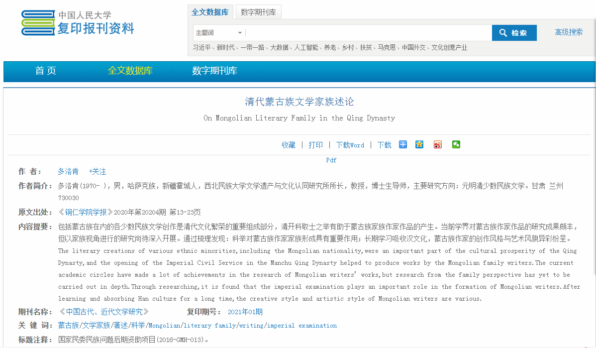 《清代蒙古族文学家族述论》一文被人大复印资料《中国古代、近代文学研究》2021年第1期全文转载