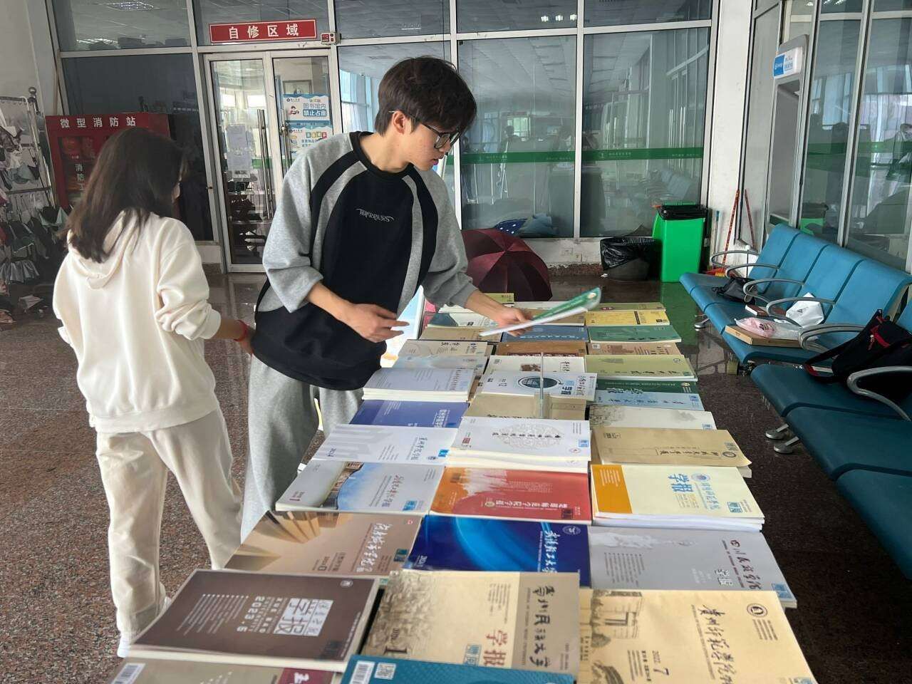 读者们纷纷驻足“漂流站”,认真挑选阅读心仪的期刊