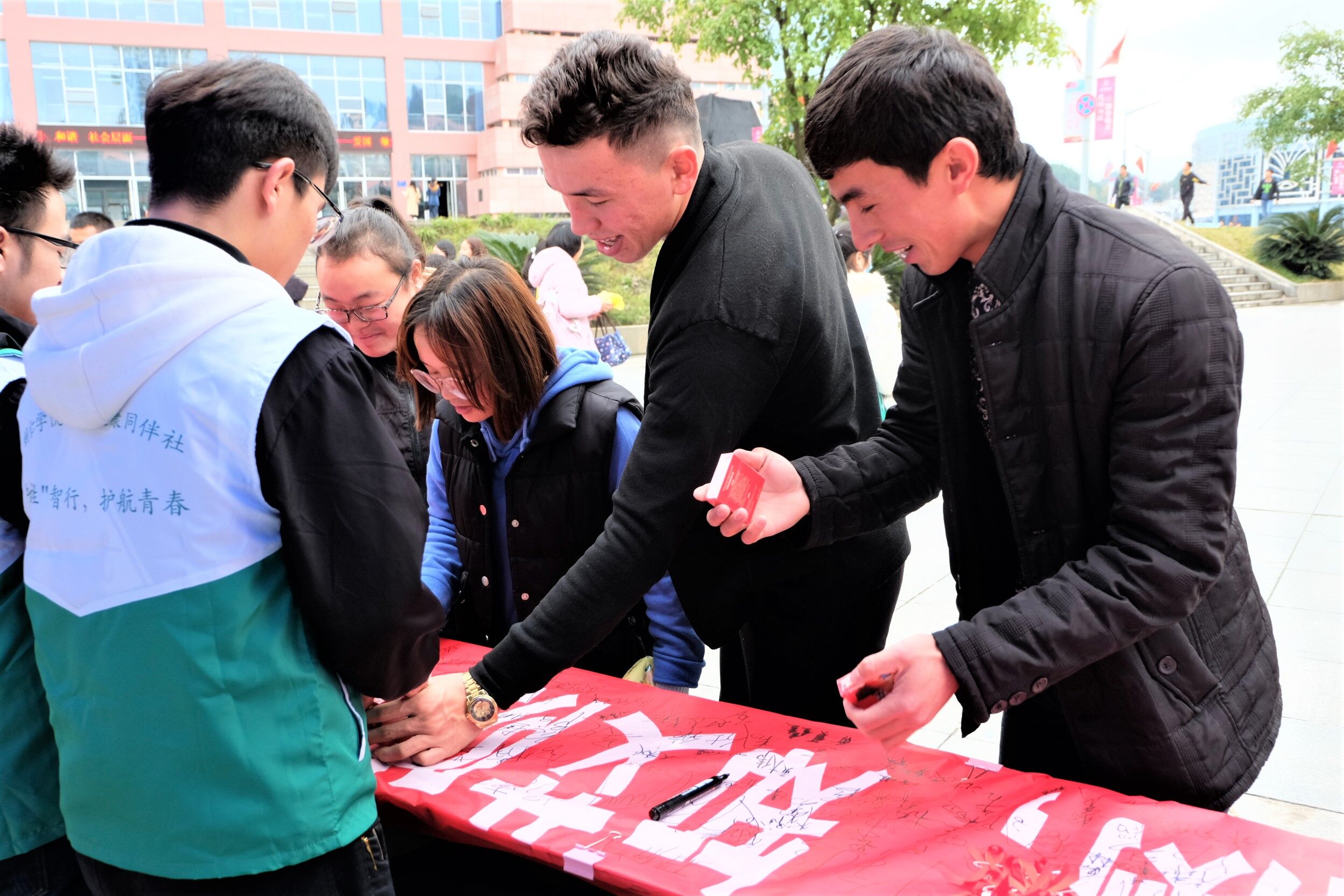活动现场,由工作人员为校内同学佩戴红丝带,红丝带代表着对艾滋病感染者的关心、支持,同时也象征着一种希望。同时由扮演“艾滋病患者”的同学,佩戴上“请给我一个拥抱”的红心,进行“呼吁拥抱”的活动,现场的同学们感触到:仿佛亲身体验了一次艾滋病感染者的心理感受,有点难受、也很失落,呼吁大家要发自内心的去关心、接纳他们。随后,为了传递“健康、安全性行为”等意识,工作人员还向校内同学发放了安全套。最后,出席活动的嘉宾和同伴社工作人员进行了合影。活动圆满结束。