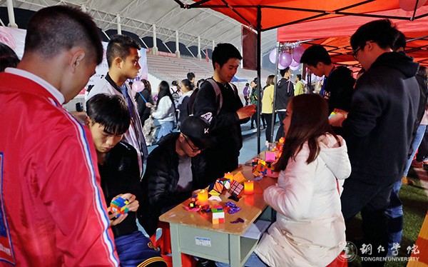 活动在beat365街舞协会带来的激情舞蹈中拉开序幕,心理健康教育中心主任宋健作了讲话并宣布活动开始。活动过程中,举行了游戏接龙、“跳蚤市场”、游戏串烧等丰富多彩的节目,同学们玩得不亦乐乎,现场秩序有条不紊,氛围热烈和谐。游戏接龙板块,采取自愿报名的方式,现场3男3女6个人为一组进行游戏,游戏内容主要有两人三足、你划我猜、指挥盲行、转动横幅“轮”,以玫瑰花或是银光棒当作接力棒,完成一个游戏内容就把它传下去,直到做完所有游戏。“跳蚤市场”板块,承办方提供一个小型交易平台,同学们把自己想要交换的东西,拿到活动现场“摆摊”,与大家进行物品互换。承办方还和学校周围的精品店、花店、小吃店等协商,通过租用商品等形式,把商品带入学校,由学生自己体验卖东西的感觉,同时创造一个小型“夜市”,为大家提供玩乐、购物的条件。游戏串烧板块,有夹气球跑:人数为10人,两人一组,背靠背夹住一只气球由起点跑向终点,在终点放一把椅子,到了终点后要把气球放到椅子上坐爆,再返回起点继续夹气球;有蒙眼作画:参与人员将眼睛蒙上,要求他们将自己的家或者其他指定东西画在纸上;有踩气球:现场人员随机组队,每队3人,每个人每只脚上都绑有相同的气球,站在指定的区域内互相踩对方的气球,在规定时间内剩余气球多的队伍获胜;还有留言收集、摸空箱子等游戏。活动中,还邀请了三校特色社团,现场书写字画、制作手工艺作品等,同时邀请了留学生参加活动。