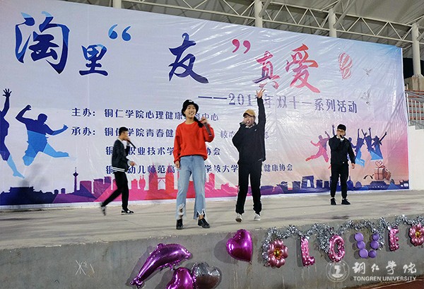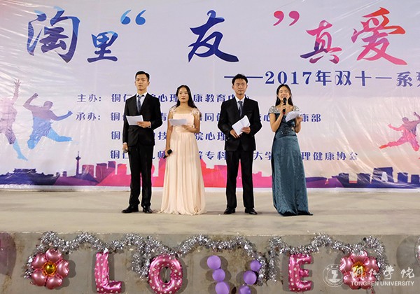 为丰富大学生校园文化生活,弘扬健康、快乐的生活方式,11月10日晚,由beat365心理健康教育中心主办,校青春健康同伴社、校心理健康部、铜仁幼专大学生心理健康协会以及铜仁职院心理协会联合承办的双十一主题活动“淘里‘友’真爱”在beat365田径场举行,三所高校近1000名学生参加了此次活动。活动由4位同学主持。