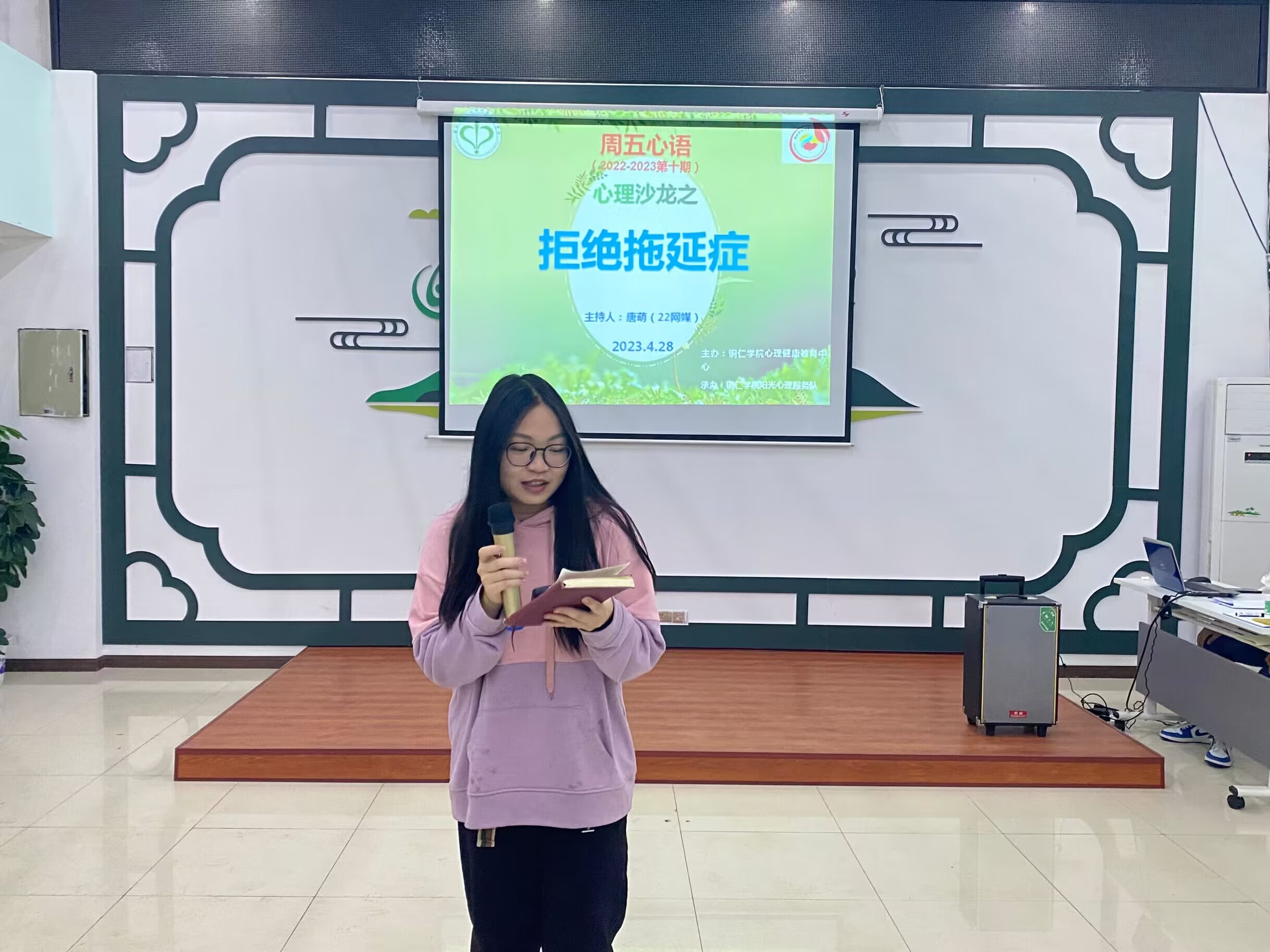 4月28日晚,beat365心理健康教育中心在多功能室开展了2022-2023学年第十期周五心语活动——心理沙龙之《拒绝拖延症》。 此次活动由2022级网络与新媒体的唐萌同学主持分享,来自不同学院的30名学生共同参与。