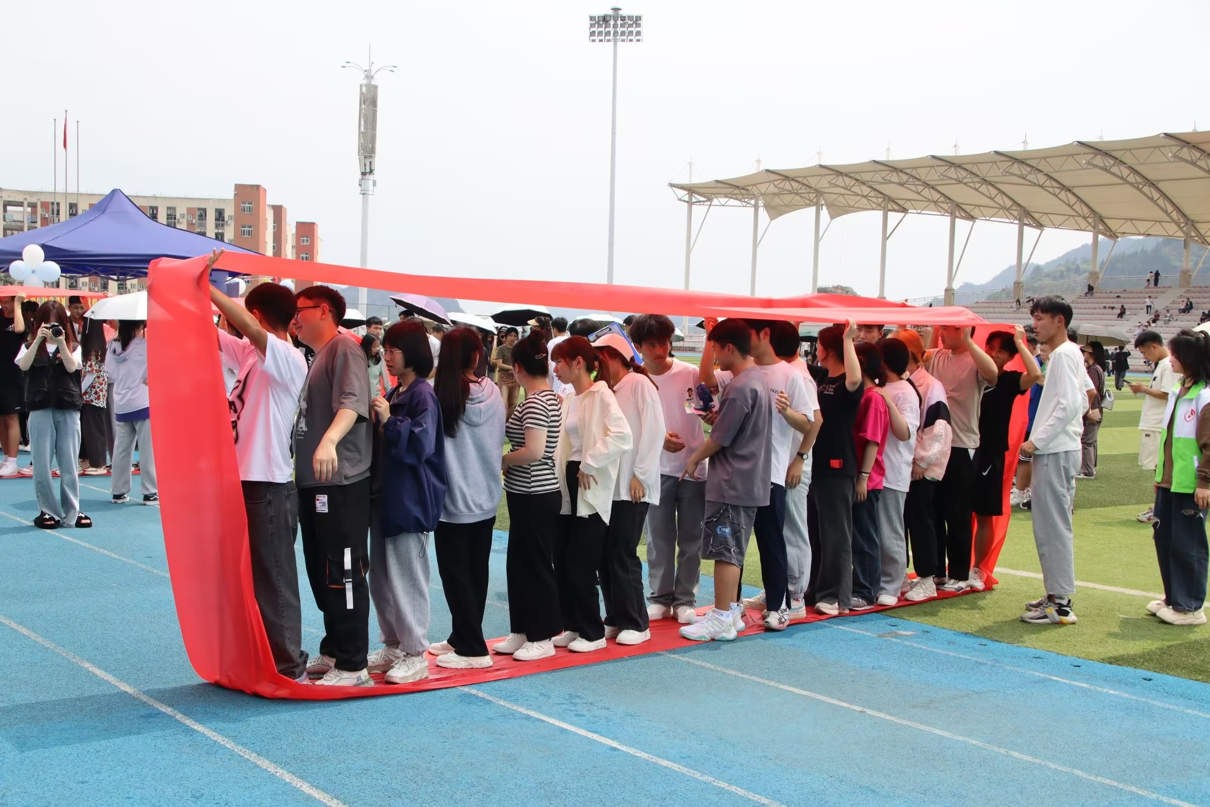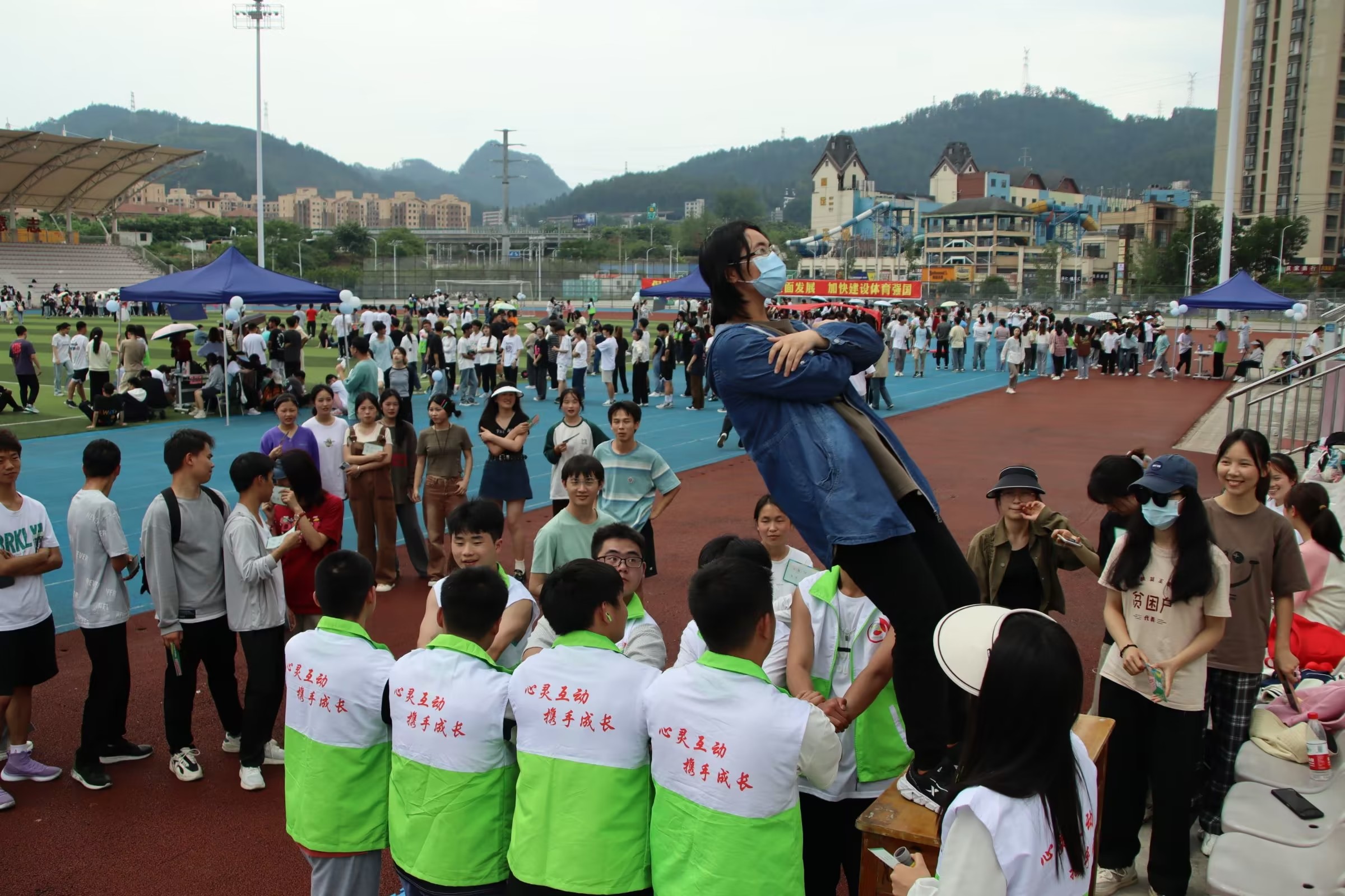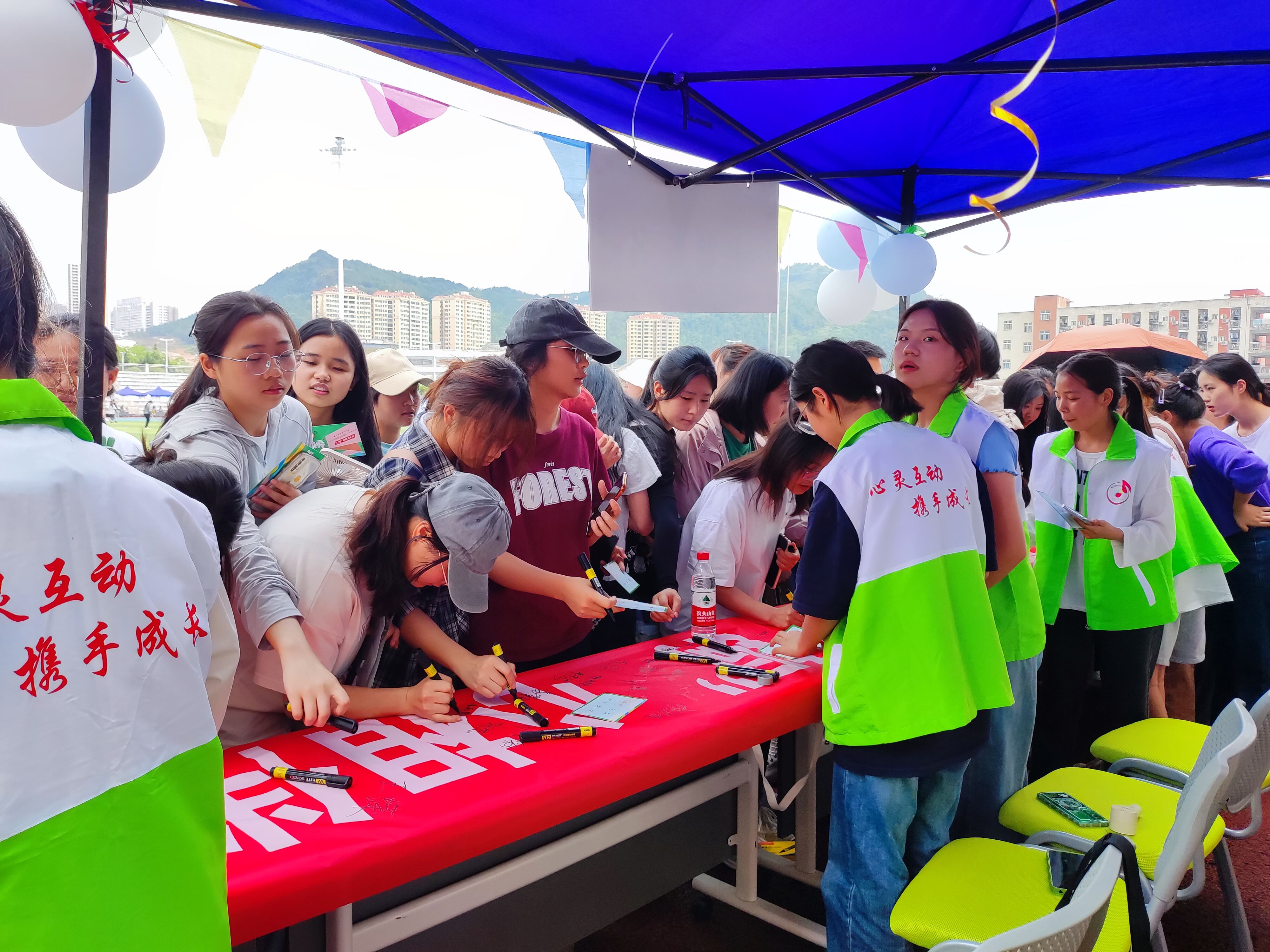 活动现场,所有活动项目同时全面进行。展示区,师生们自由参观本届“5·25心理健康活动月”系列活动成果。竞赛区,各二级学院代表队对“高压电网”“同心圆”“小火车”“风火轮”四项心理健康趣味活动展开激烈角逐,队员们互相鼓励,并肩作战,加油声、口号声在足球场上空久久回荡。互动区,参与类活动“主题签名”“心语心愿”,体验类活动“珠行万里”“同舟共济”,挑战类活动“齐心协力”“信任背摔”,都深受同学们的喜欢,大家积极参与,并通过参加活动集章领到了自己喜爱的奖品。