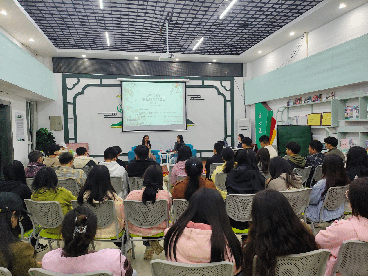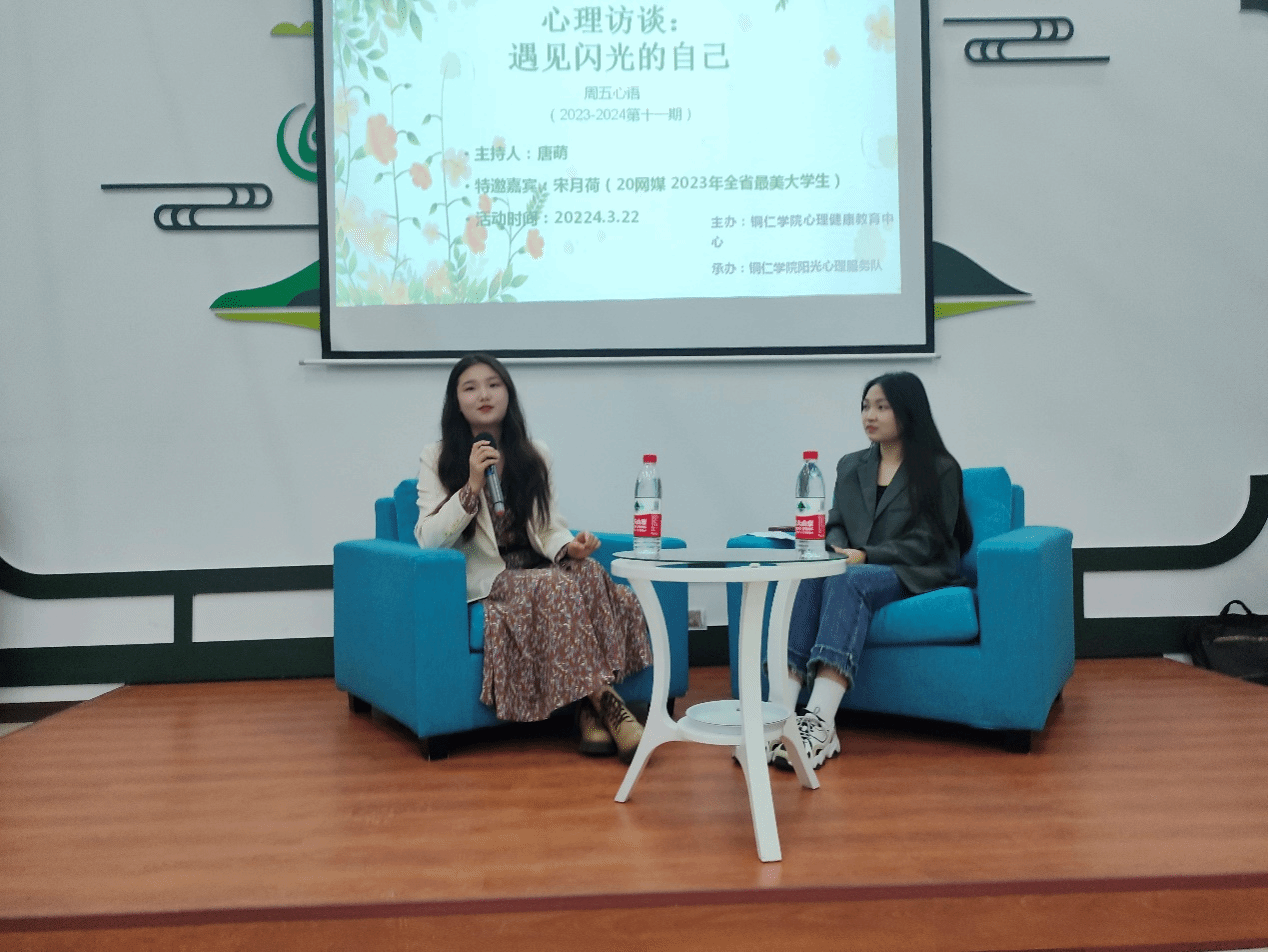 3月22日晚,beat365心理健康教育中心在多功能室开展了2023-2024第十一期周五心语活动——心理访谈之“遇见闪光的自己”。本次活动由2022级网络与新媒体班唐萌同学主持,特邀全省“最美大学生”获得者、beat3652020级网络与新媒体班宋月荷同学作分享与交流,共有50名来自不同学院的同学共同参与。