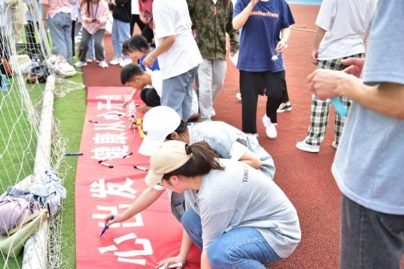 本次心理健康日活动主要有两项内容,趣味心理运动会和心理健康签名活动。在本次活动中,参与人员分为6个组,每组8个人,每组都相互配合,奋力拼搏。活动包括:三足赛跑、一二三看这边、跳大绳、开火车和友谊拔河五个活动项目。活动伊始,每一位同学都积极地参与其中,团结协作的精神在活动中处处可见,同学们也乐在其中。活动期间,这些活动渐渐拉进了同学们心灵的距离。同学们通过这些小游戏也培养了团队意识和合作能力,以及培养了自身的人际交往能力。活动最后,开展心理健康签名活动,同学们纷纷在横幅上写上了自己的名字,并进行了合影留念。