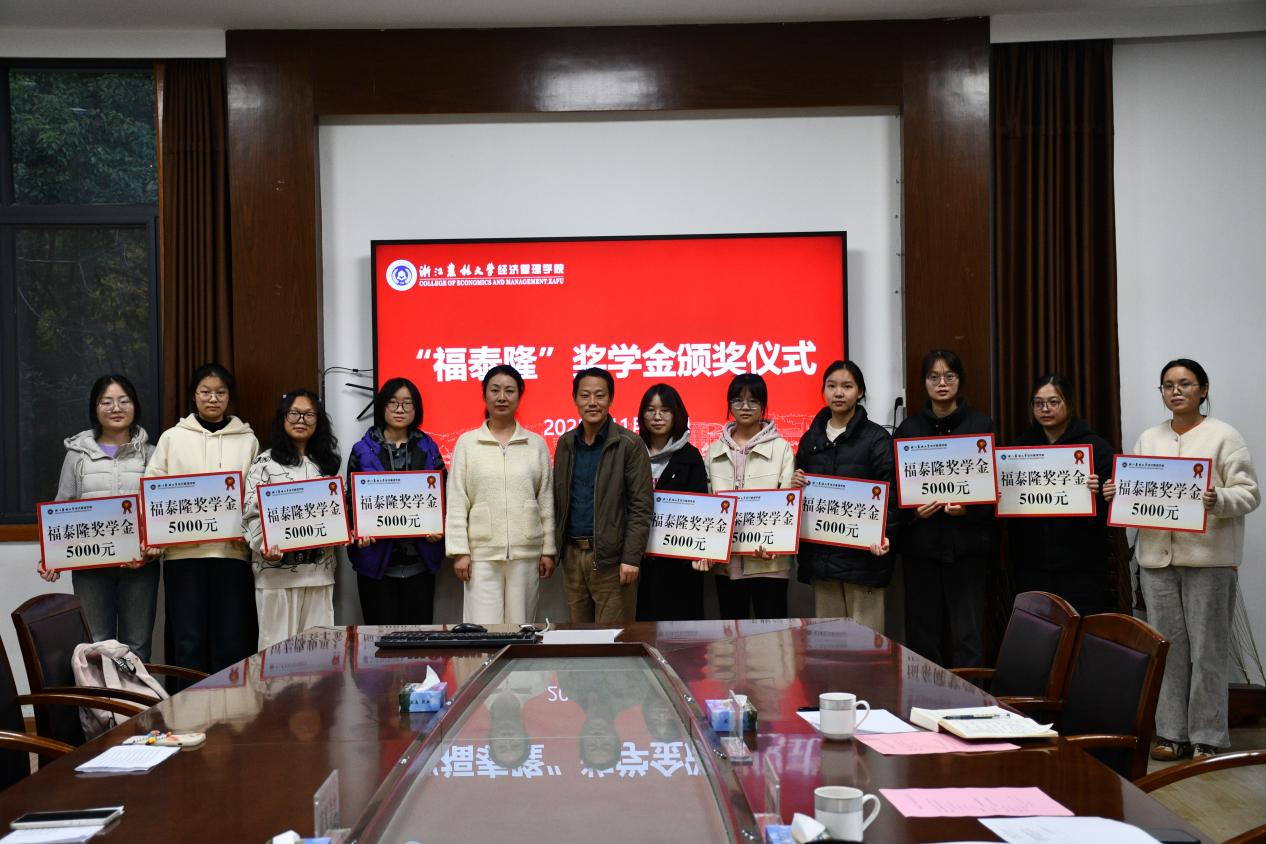 开云官网举行2025年“福泰隆”奖学金颁奖仪式 11月27日,“福泰隆”奖学金颁奖仪式在西大楼208会议室举行。浙江福泰隆连锁超市有限公司行政总监唐俊、开云官网党委书记陈劲松、获奖学生代表出席会议。颁奖仪式由学院党委副书记曹磊主持。唐俊代表企业致辞并为获奖学生颁奖,她满怀关切与期许,勉励同学们珍惜当下的学习时光,不断探索求知,在实践中锤炼本领,勇于创新,开拓进取,为社会发展贡献自己的智慧与力量。获奖学生满怀诚挚感恩之情,向给予捐赠的福泰隆公司及悉心...