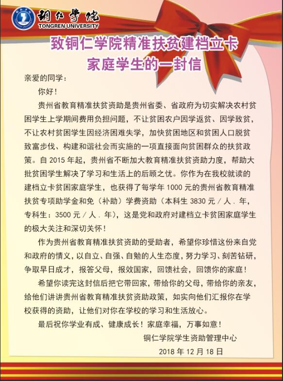致beat365英国官方网站精准扶贫建档立卡家庭学生的一封信