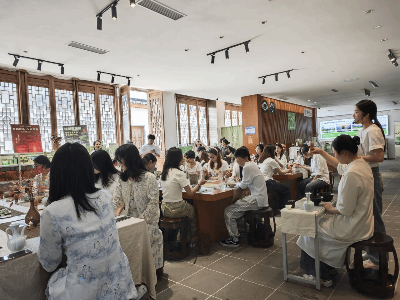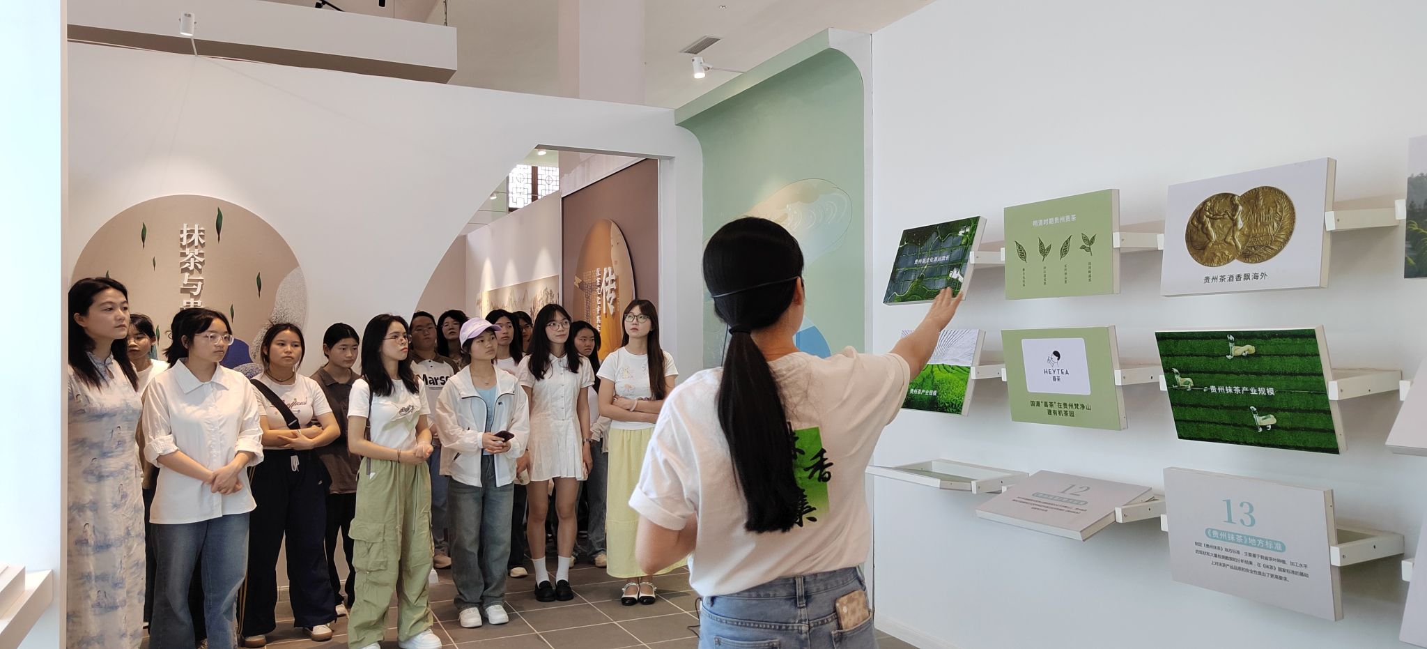 在专业讲解员引领下,同学们走进抹茶文化演进展区。古老的文物、泛黄的古籍,每一件展品都像是一位缄默的史官,静静诉说着贵州抹茶文化的前世今生。从古代文人墨客对抹茶的吟诵,到抹茶在不同历史时期的地位变迁,同学们仿佛穿越时空,真切感受到了抹茶文化厚重的历史底蕴。在抹茶成品展览区,玻璃展柜里陈列着古今交融的匠心之作。传统竹制茶筅轻倚在古朴的茶碗旁,与造型简约的现代包装礼盒相映成趣,诉说着抹茶跨越千年的美学蜕变。