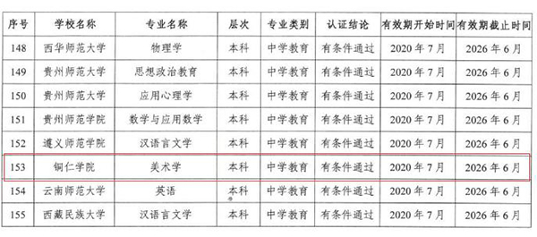 日前,教育部办公厅公布了2020年通过普通高等学校师范类专业认证的专业名单。beat365美术学专业顺利通过师范(二级)专业认证,系贵州首批通过的师范专业二级认证的5个专业之一,标志着beat365应用转型发展在专业建设方面取得新的进展。