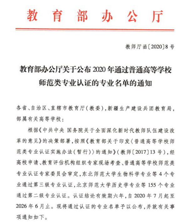 据悉,本次教育部公布的通过师范类专业认证的名单中,东北师范大学生物科学专业等4个专业通过第三级专业认证,北京师范大学历史学专业等155个专业通过第二级专业认证。
