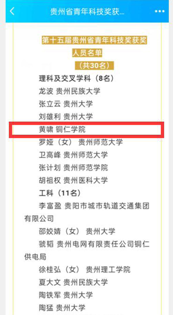第十五届贵州省青年科技奖共30名青年科技工作者获得,该奖项每两年评选一次,主要表彰在全省经济发展、社会进步和科技创新中作出突出贡献并取得显著业绩的青年科技人才。