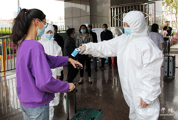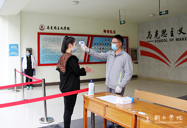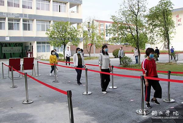 教学楼是师生集中出入最密集的地方,学校在每栋教学楼、各个学院的入口都设立了检测登记点,并将入口与出口分开,让师生进出更顺畅有序。“请戴好口罩,保持距离,靠右边排队。”“教学楼的出口在那边!”演练中,工作人员对进出的“师生”进行体温测量,提醒大家要规范戴好口罩、清洗手部卫生等有关注意事项,引导大家有序进出。教室里,任课老师对“同学们”进行引导,大家按照要求,保持一定距离,在指定的位置坐下来上课。