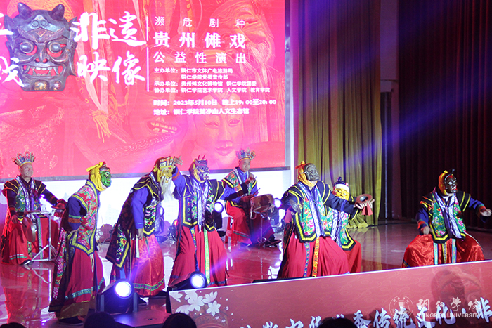 此次非遗文化进校园,旨在深入学习贯彻党的二十大精神,以公益性演出为抓手,以文化传播和艺能保护传承为目标,以古朴、热烈、原生态为主基调,生动展现铜仁经典傩戏傩技原貌,以“展演+流动展览+有奖知识问答”为形式,多角度、多手段充分展示古朴神秘的贵州铜仁傩文化,为广大青年学生奉上了丰富精彩的非遗文化盛宴。