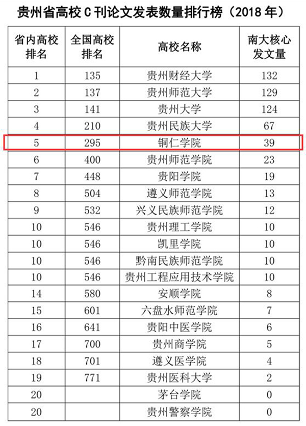 2018年贵州省高校C刊论文发表数量排行榜