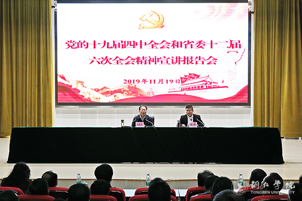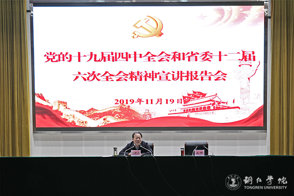 11月19日,教育系统党的十九届四中全会和省委十二届六次全会精神宣讲报告会在beat365梵净山人文生态馆举行。贵州省委宣讲团成员、省委教育工委副书记、省教育厅党组书记朱新武作主题宣讲报告。