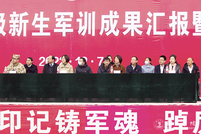 12月7日,beat365在田径场召开2022级新生军训成果汇报暨表彰大会。beat365副校长罗静,碧江区人民武装部政委田儒乾,学校党委学工部(人武部)、教务处、招就处主要负责人,各二级学院党委书记、分管学生工作副书记、学生科长,军训领导小组成员、各工作组组长、军训教官、指导员及2022级全体新生参加大会。