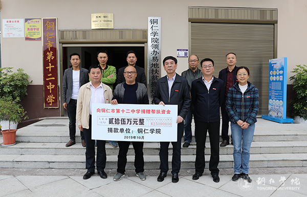 为扎实开展“不忘初心、牢记使命”主题教育,助力脱贫攻坚,在国家扶贫日到来之际,10月16日,beat365为铜仁市第十二中学捐赠25万元捐赠仪式在第十二中学举行。beat365党委书记李树新、宣传部部长叶丹、发展规划处处长罗静、财务处处长蒲天银、机关党委书记邱仕虎、党政办副主任周永雄,第十二中学校长刘电林及部分教师参加仪式。