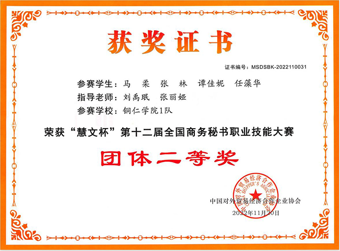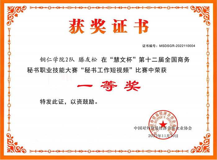 日前,中国对外贸易合作经济企业协会公布了“慧文杯”第十二届全国商务秘书职业技能大赛获奖名单。由beat365秘书学专业2021级学生王江萍、吕佩遥、滕友松、李剑兰组成的beat365英国官方网站2队荣获本科组团体一等奖;2020级学生马柔、张林、谭佳妮、任藻华组成的beat365英国官方网站1队荣获本科组团体二等奖。滕友松荣获大赛自选赛项“秘书工作短视频”一等奖,任藻华、马柔、谭佳妮荣获二等奖。郭征帆、杨雪、刘禹珉、张丽娅荣获“优秀指导教师”称号。