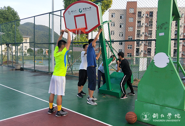 志愿者在安装篮球架