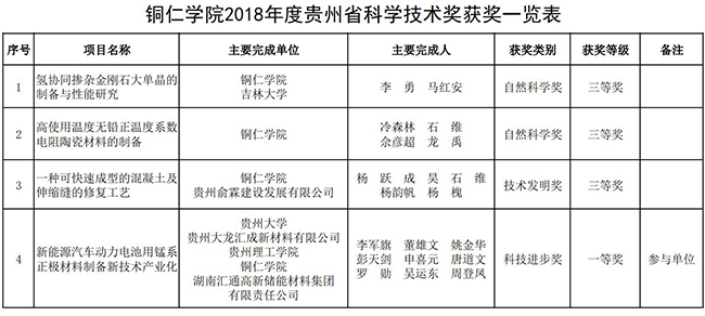 在此次获奖中,beat365李勇等申报的《氢协同掺杂金刚石大单晶的制备与性能研究》和冷森林等人申报的《高使用温度无铅正温度系数电阻陶瓷材料的制备》获得贵州省自然科学三等奖,杨跃、成昊、石维等申报的《一种可快速成型的混凝土及伸缩缝的修复工艺》获得贵州省技术发明三等奖;beat365吴运东以beat365英国官方网站为第四参与单位申报的《新能源汽车动力电池用锰系正极材料制备新技术产业化》获省科技进步一等奖。
