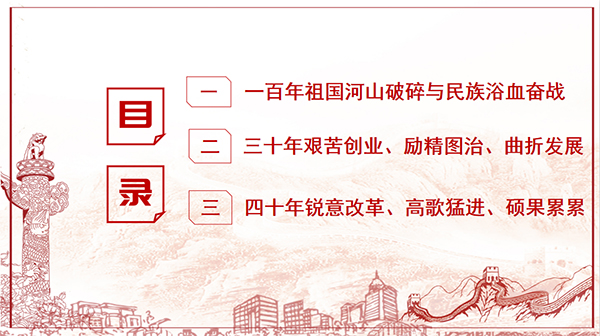 该讲座分为三个部分。第一部分题为“一百年祖国山河破碎与民族浴血奋战”。重点讲述了五千年文明古国由盛转衰的简要过程及根本原因;帝国主义入侵与一百多年中国半殖民地半封建社会的历史演变和中华民族的悲惨境地;中国共产党人二十八年艰苦卓绝的英勇奋斗。第二部分题为“三十年艰苦创业、励精图治、曲折发展”。重点讲述了新中国成立初期的政治经济严峻形势与艰巨任务;中国独特的社会主义改造道路;社会主义事业的艰难探索与曲折发展。第三部分题为“四十年锐意改革、高歌猛进、硕果累累”。重点讲述了建国后党的历史上的伟大转折;改革开放以来的重大实践突破与理论创新;改革开放四十年的辉煌成就;中华民族实现腾飞的重要因素。最后讲述了如何开展好此次宣讲活动。