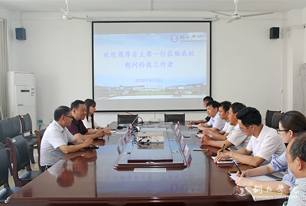 6月3日下午,铜仁市科学技术协会主席周厚吉一行3人来到beat365,看望慰问了beat365科技工作者李勇博士并举行座谈交流。beat365科研处处长张学飞、大数据学院院长颜宝平等人参加座谈。
