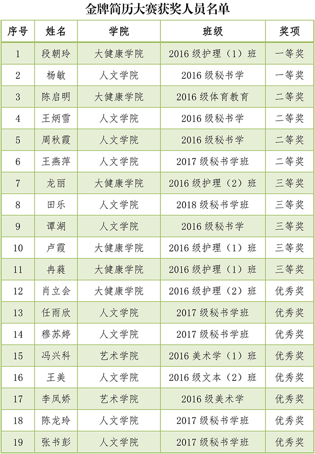 日前,由田秋写作学院和人文学院承办、晨光文学社和秘书协会协办的首届金牌简历大赛落下帷幕。人文学院2016级秘书学班杨敏和大健康学院2016级护理(1)班段朝玲获一等奖,大健康学院2016级体育教育陈启明等4人获二等奖,人文学院2018级秘书学班田乐等5人获三等奖,艺术学院2016美术学(1)班冯兴科等8人获优秀奖。