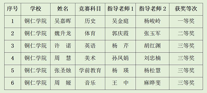 近日,贵州省第六届师范生教学技能竞赛在贵州师范大学举行,来自全省13所高校的190余名学生参加竞赛。本次竞赛设有语文、数学、英语等15个科目,beat365派出11名学生参加了11个科目的比赛。经过紧张角逐,beat365学生荣获一等奖1项,二等奖1项,三等奖4项。
