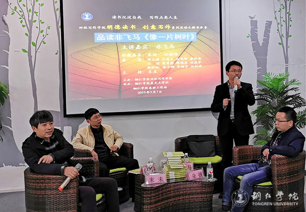 分享会上,非飞马首先向到场的各位嘉宾和同学表示感谢,接着与大家分享了自己在诗歌创作道路上的经验:以一个学生的身份去学习,写诗时不仅仅要有热情,还要有真正的良知,要让文字发出人性的光芒。朵孩说非飞马的诗直指心灵、抒情性很强,《像一片树叶》就是他用诗歌的方式抒写人生传奇的一个缩影。任敬伟说非飞马的诗具有强烈的颠覆意识,思维的冲击力很大,而且具有幽默的审美风格,打破了常规的语言。主持人末未认为非飞马的《像一片树叶》是把诗歌与生命、生活、精神融合在了一起。同时,出席本次分享会的庄鸿文、向笔群、唐竹英、蒲秀彪、陈明彦、涂文辉、王进等嘉宾也分享了自己读《像一片树叶》的感受。到互动环节时,同学们踊跃向在座的嘉宾们提问,嘉宾们深入浅出的为同学们一一作答。