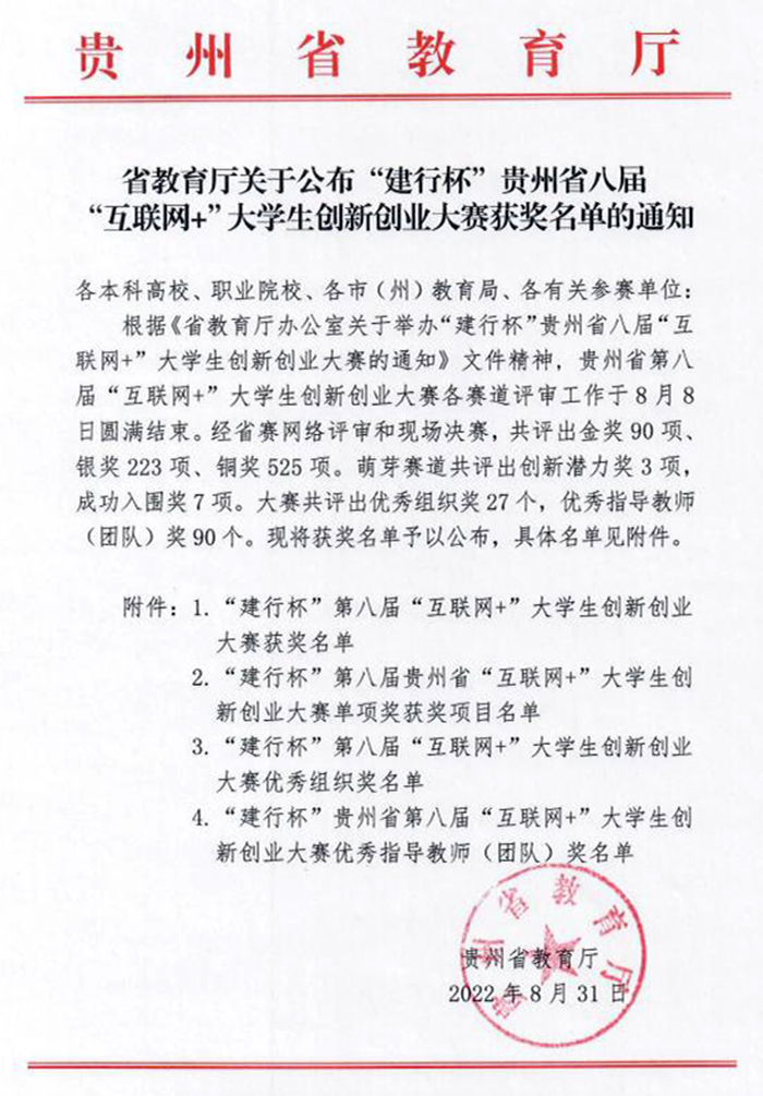 近日,由贵州省教育厅主办,贵州大学承办的“建行杯”第八届“互联网+”大学生创新创业大赛贵州赛区决赛圆满收官。来自全省各高校的313个项目参与了高教主赛道、“青年红色筑梦之旅”赛道、职教赛道和产业命题赛道的角逐,beat365获得了3个赛道的1个银奖和13个铜奖的好成绩。