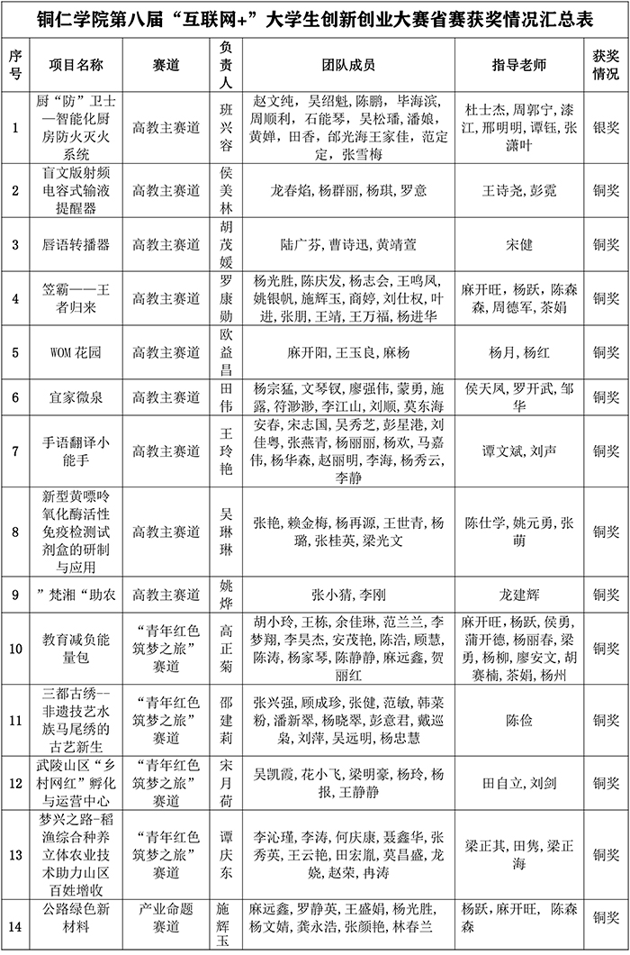 在本届比赛中,由材料与化学工程学院杜士杰等老师指导的项目《厨“防”卫士——智能化厨房防火灭火系统》摘得高教主赛道银奖,《“梵湘”助农》等8个项目获高教主赛铜奖,《教育减负能量包》等4个项目分获青年红色筑梦之旅赛道铜奖,《公路绿色新材料》项目首次参加产业命题赛道获得铜奖。
